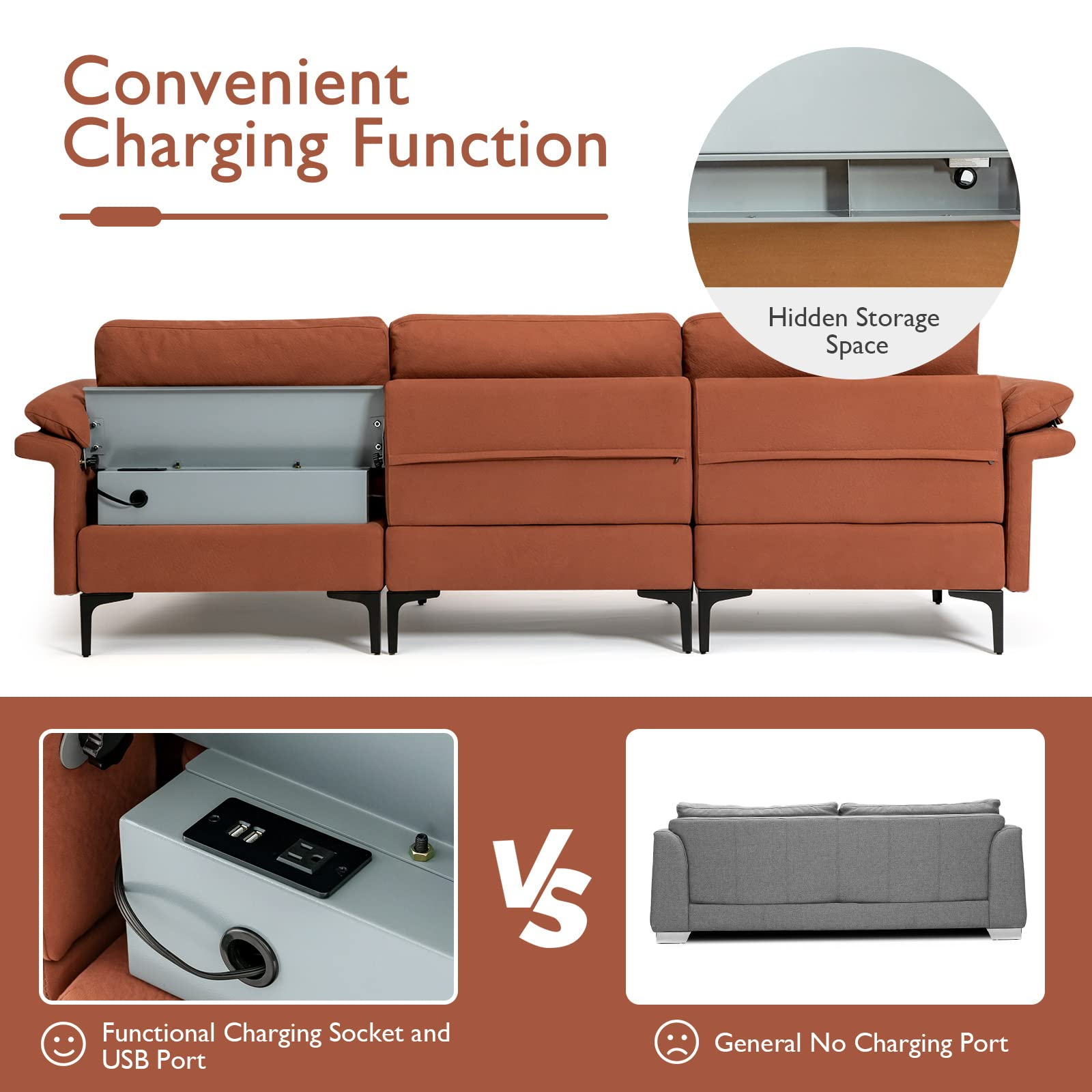 - Designed for Convenience: Features 1 standard outlet and 2 USB ports, and has a hidden compartment and armrest organizer caddy.