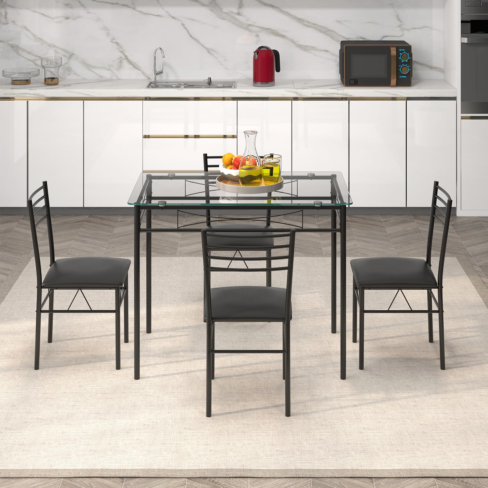 This is a compact dining set crafted for small spaces. It includes a rectangular glass table and four matching chairs, making it perfect for kitchens, apartments, or compact dining areas.