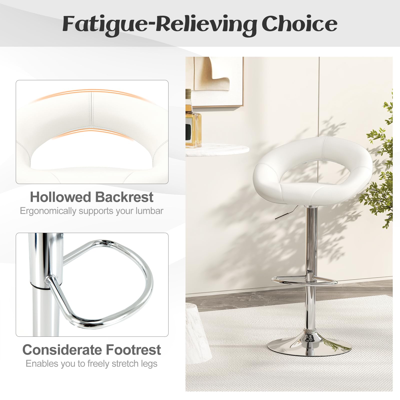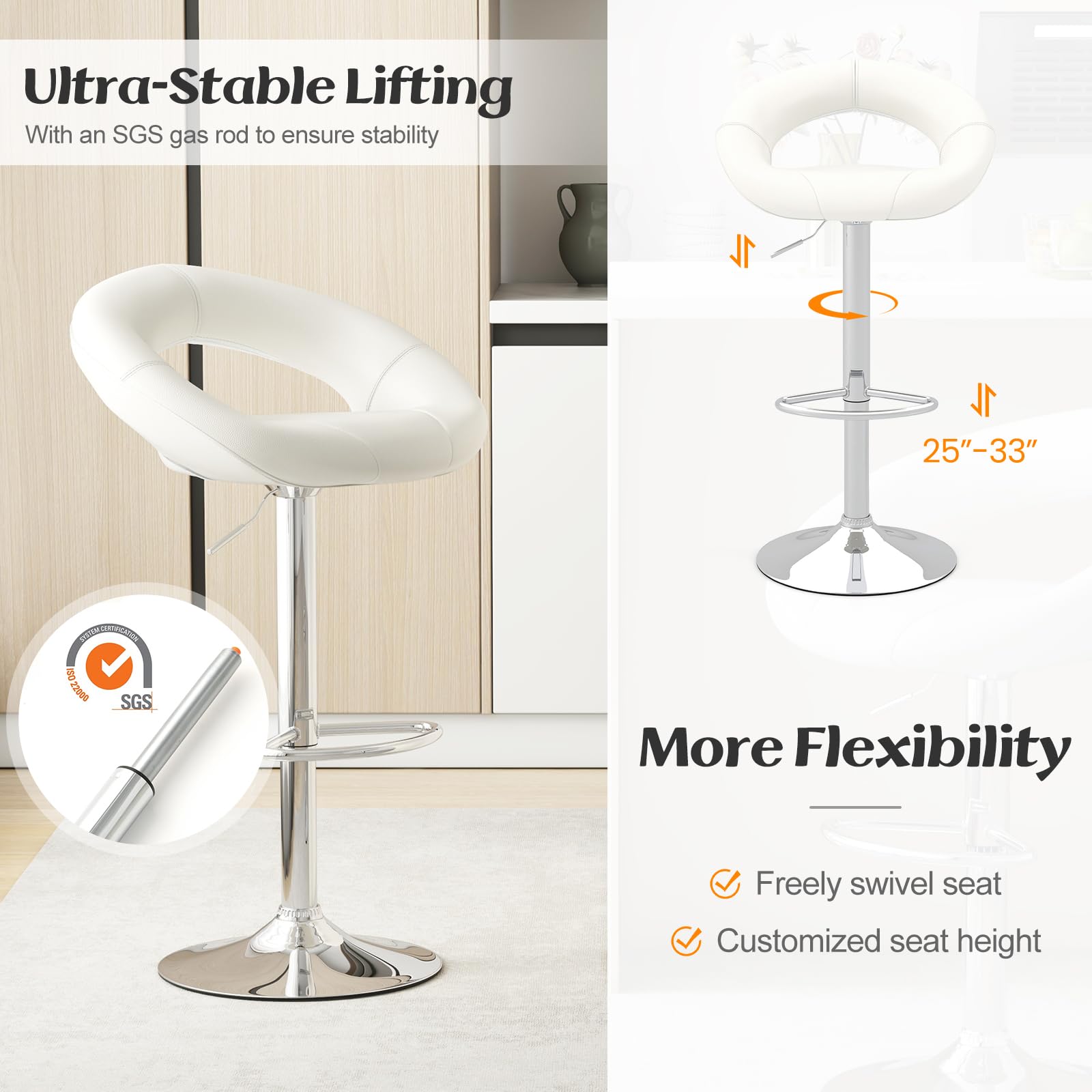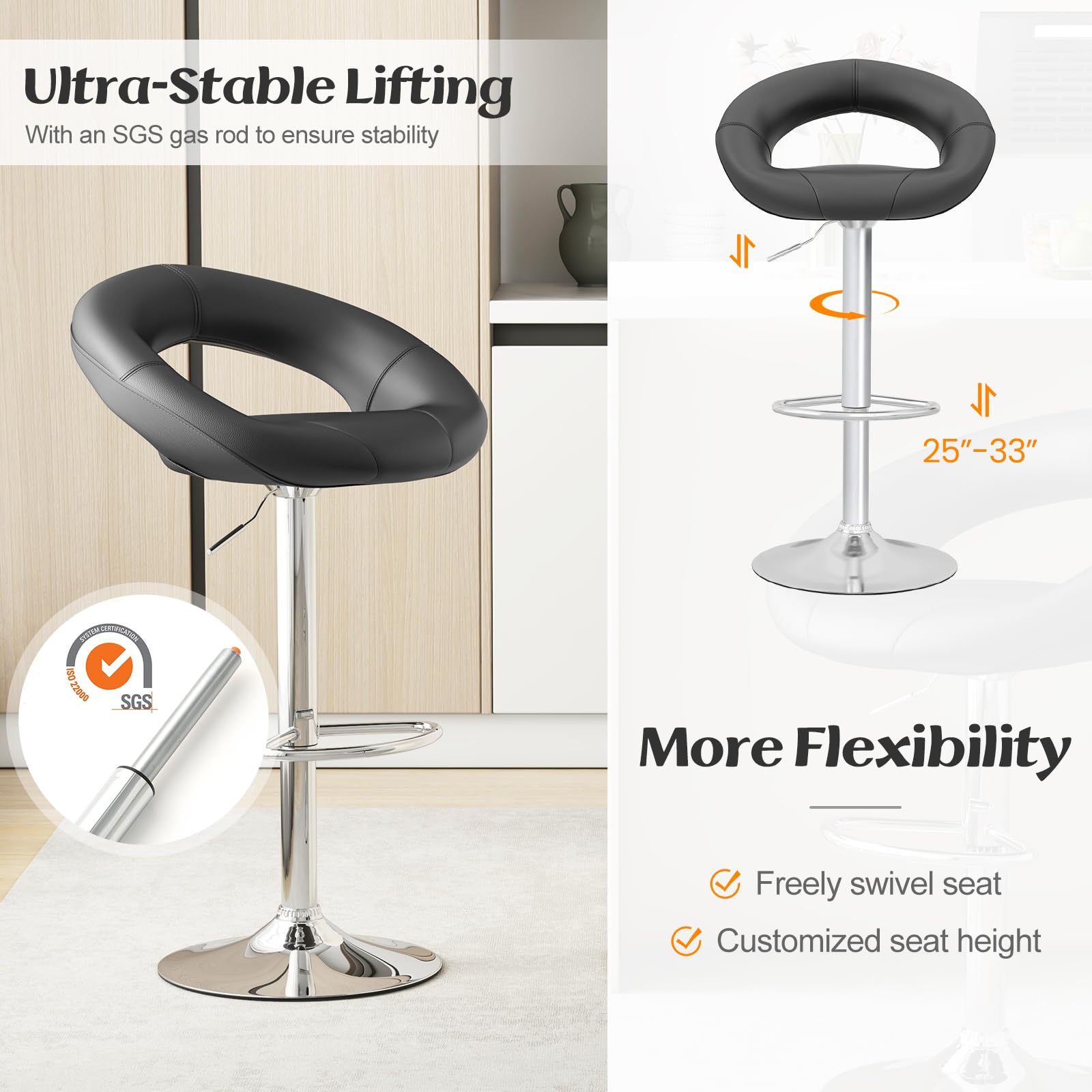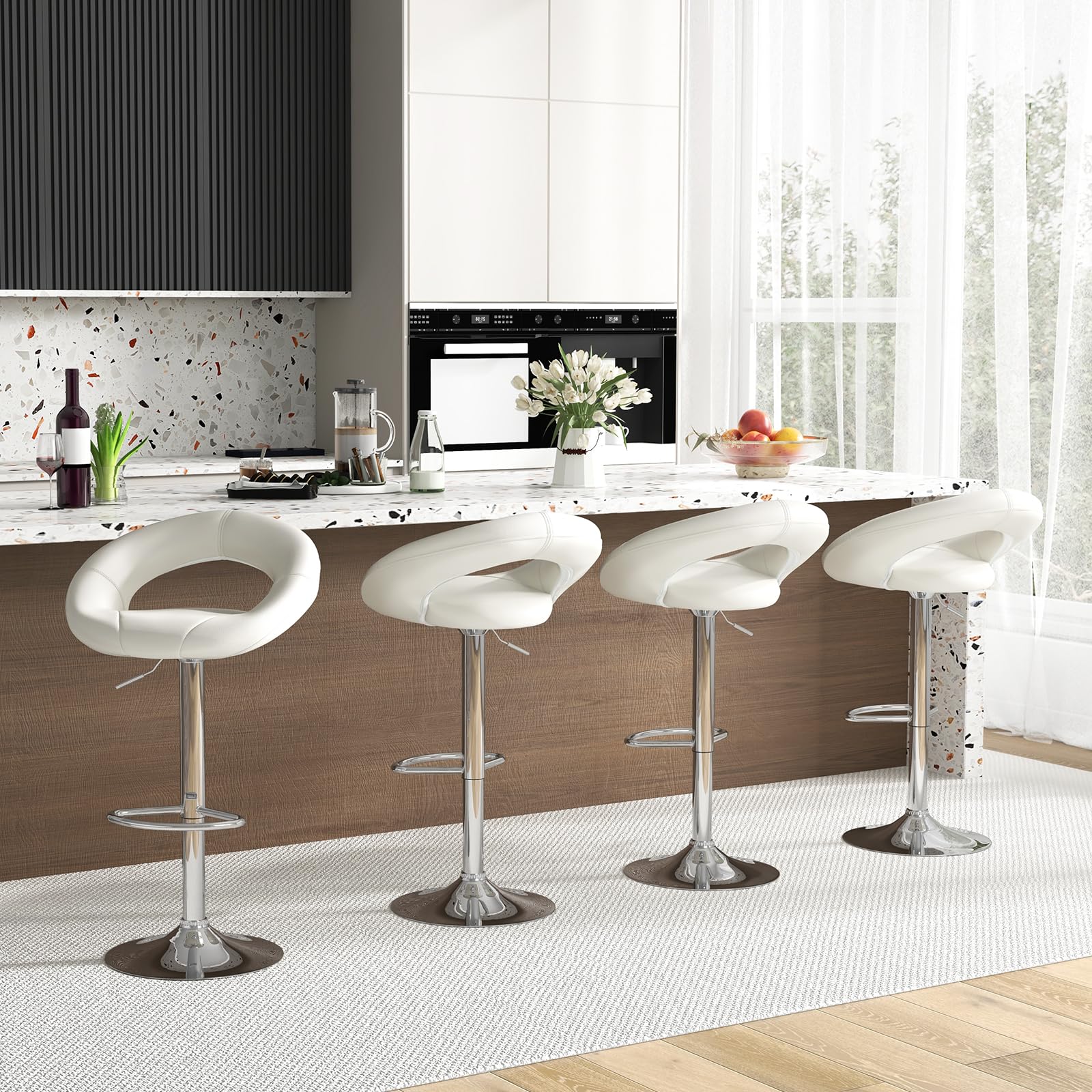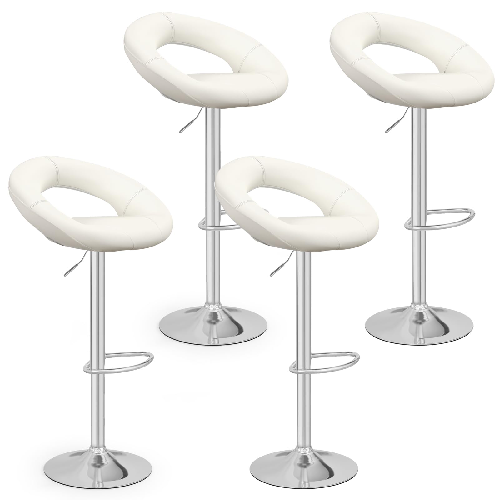 These bar stools are perfect for high tables and counters. They come with an adjustable height mechanism, a cushioned seat, and a stylish ring – shaped backrest. With a modern design, they can enhance the look of any kitchen, bar, or living room.
