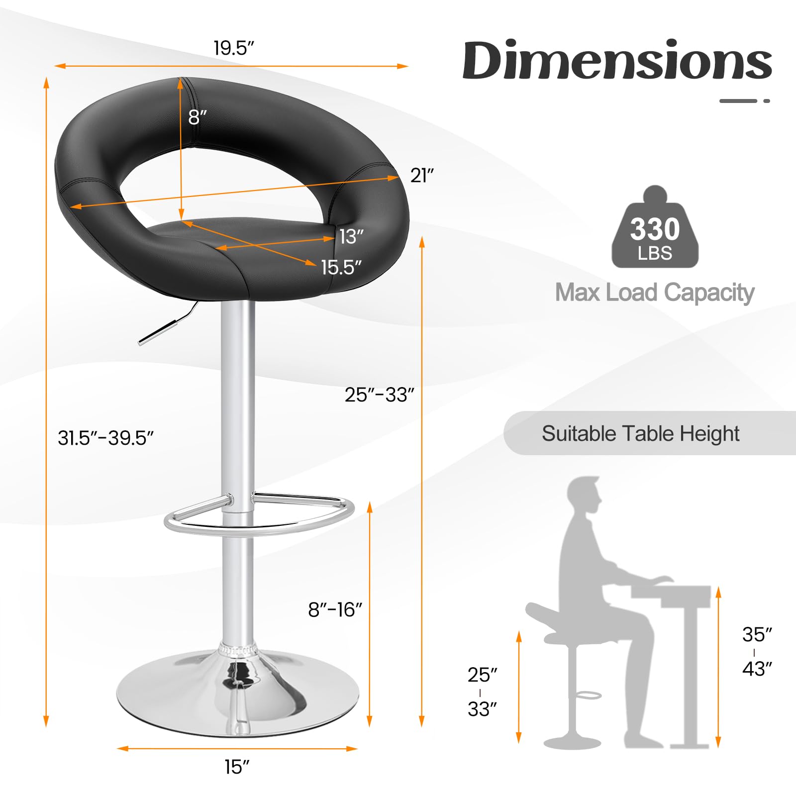 | Seat height | 25″–33″ (suitable for tables 35″–43″ tall) |