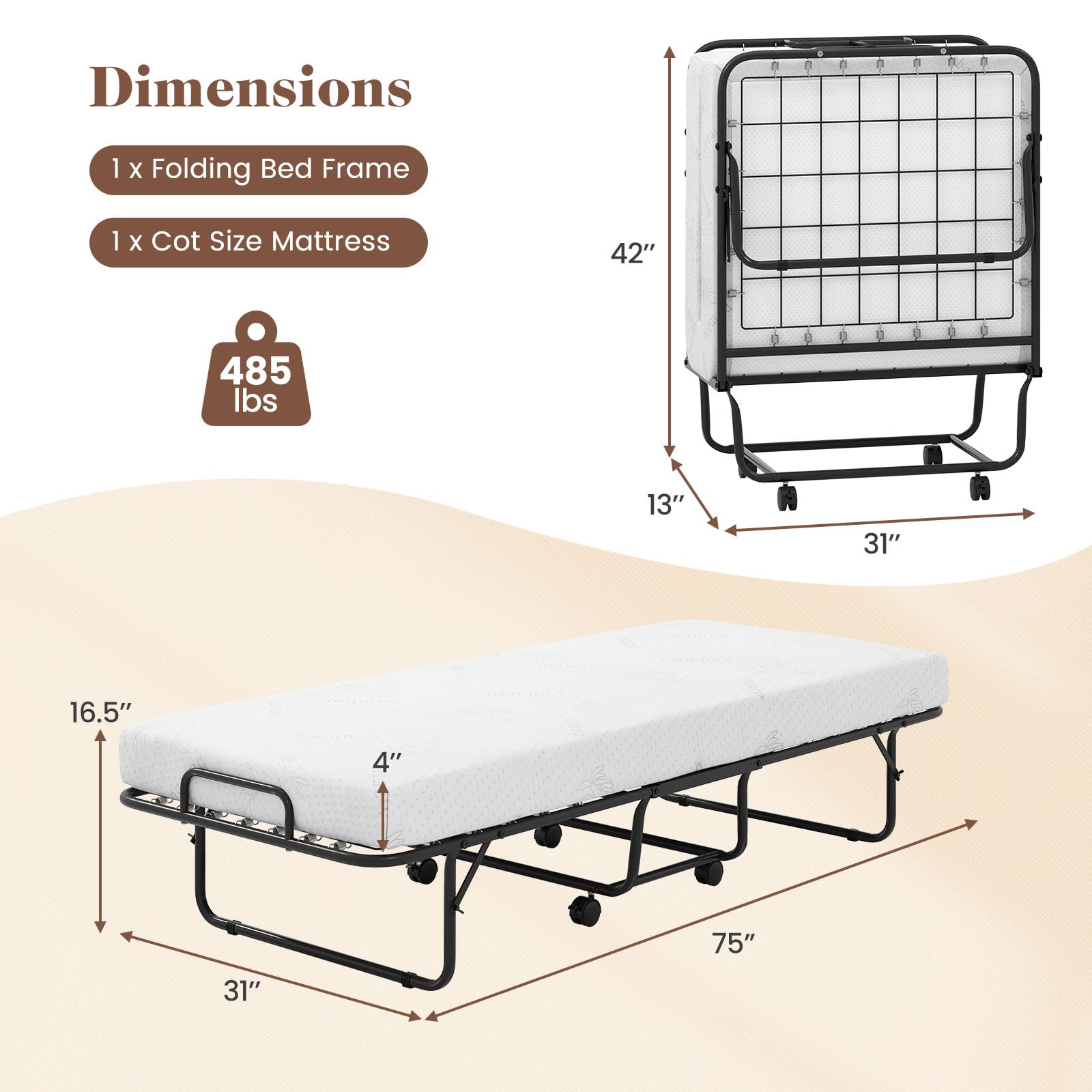 Size (Folded) Compact, vertical form (half the length of the extended bed)