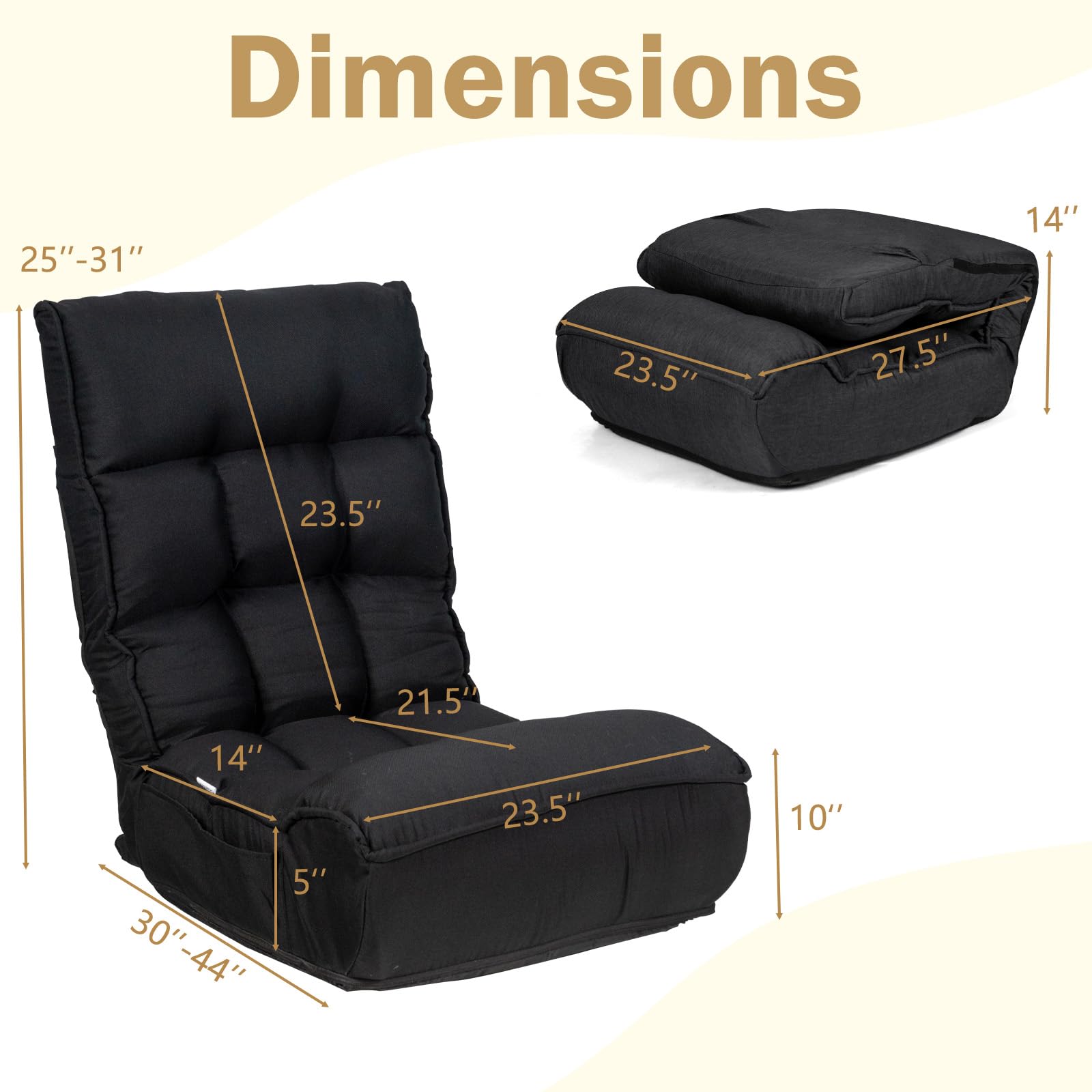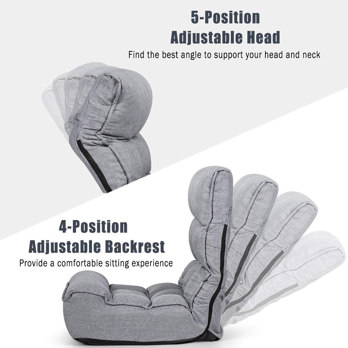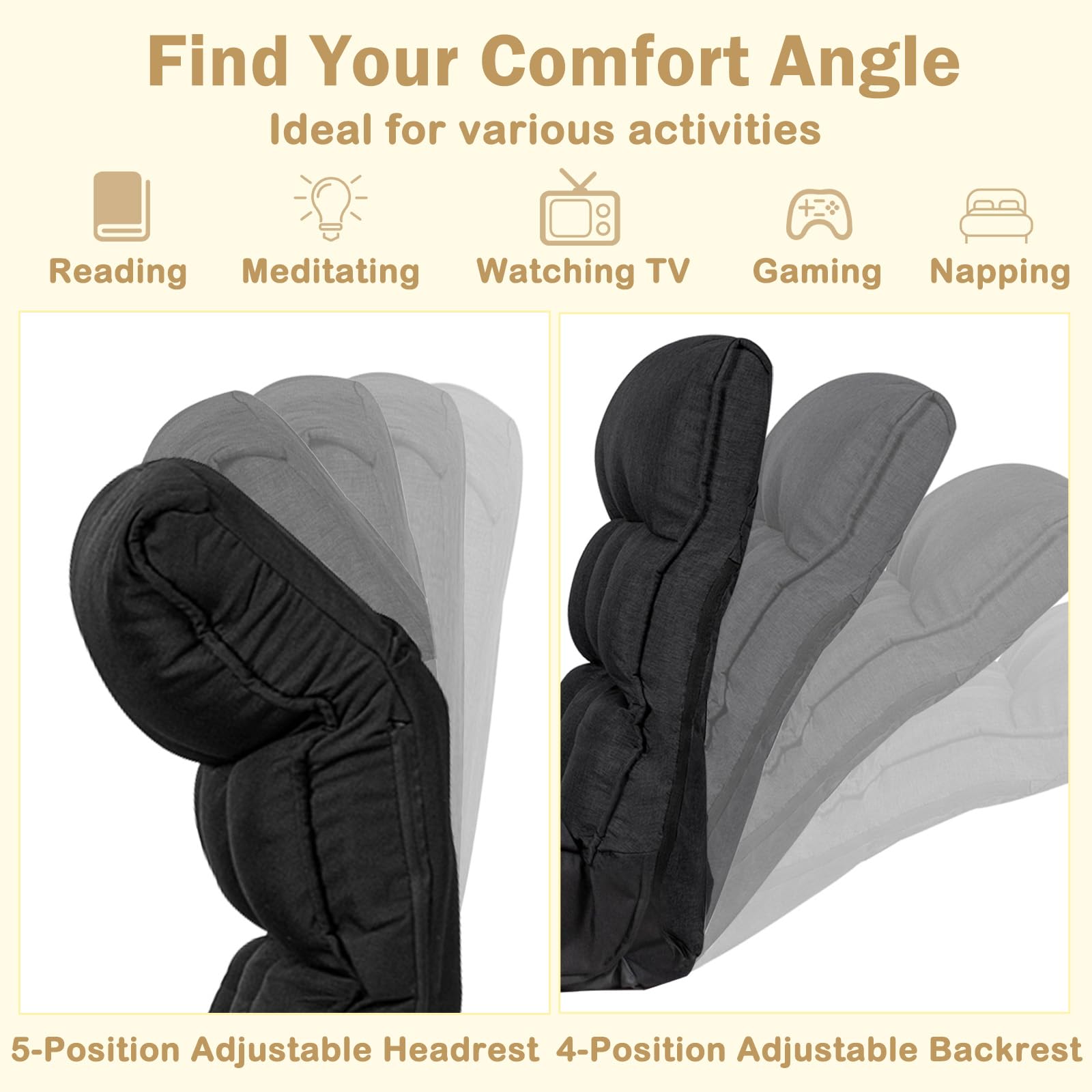 - Multi-Position Adjustable Back & Head: The backrest can be adjusted into 4 different positions, and the headrest can be adjusted into 5 different angles.