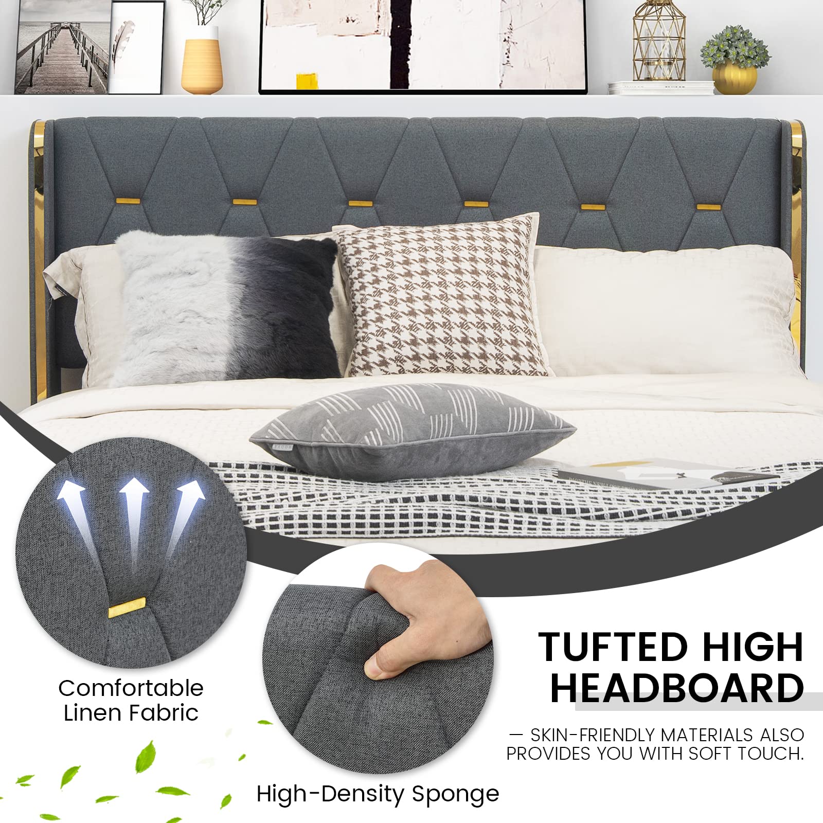 - Tall headboard for back support and gold accents for aesthetic appeal.