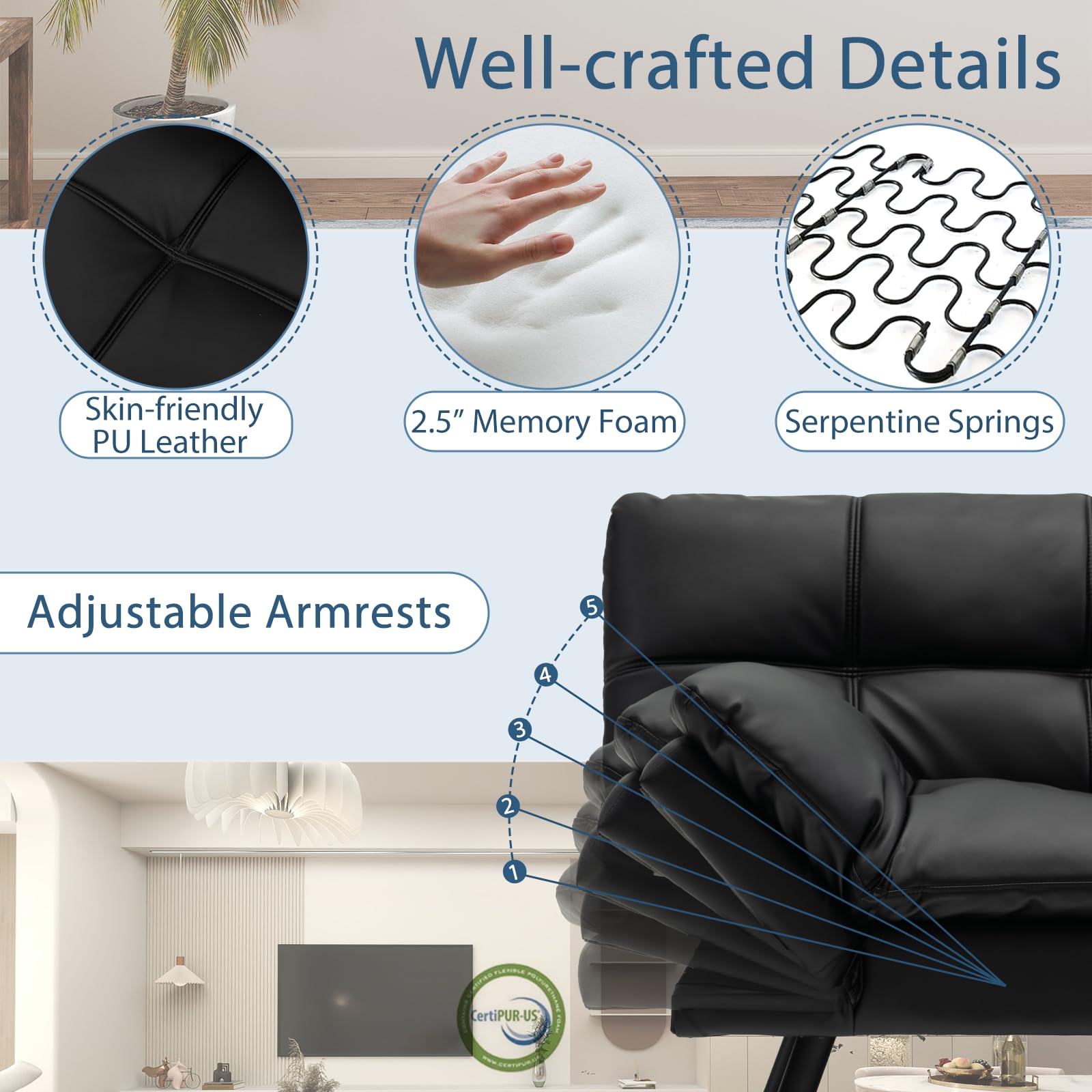 - Comfortable Upholstery: Covered with skin – friendly and breathable materials, the backrest and seat are filled with 2.5” thick CertiPUR – US certified memory foam for exceptional comfort and safety.