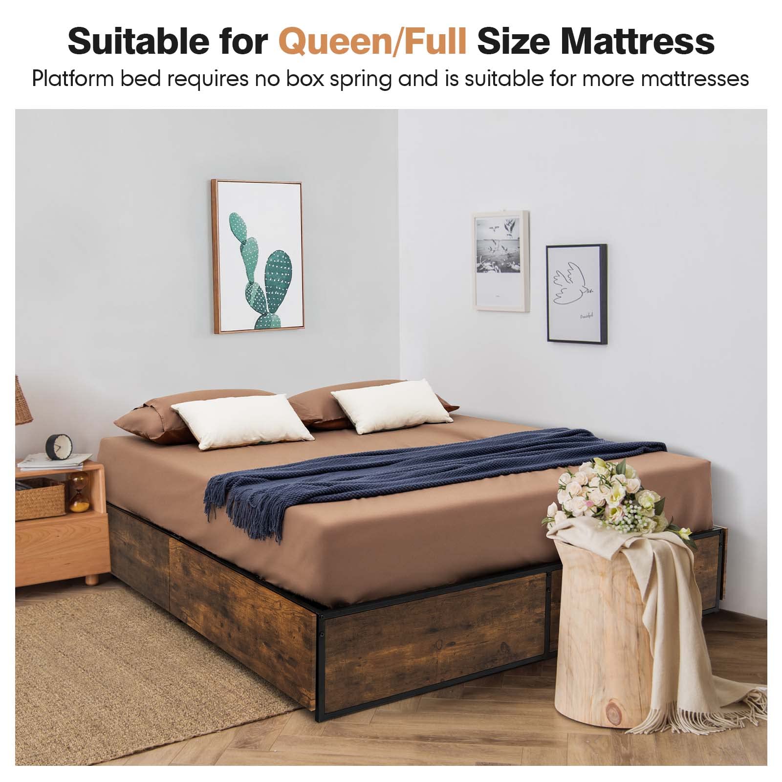 - Sturdy metal slats that eliminate the need for a box spring and are compatible with Queen/Full size mattresses