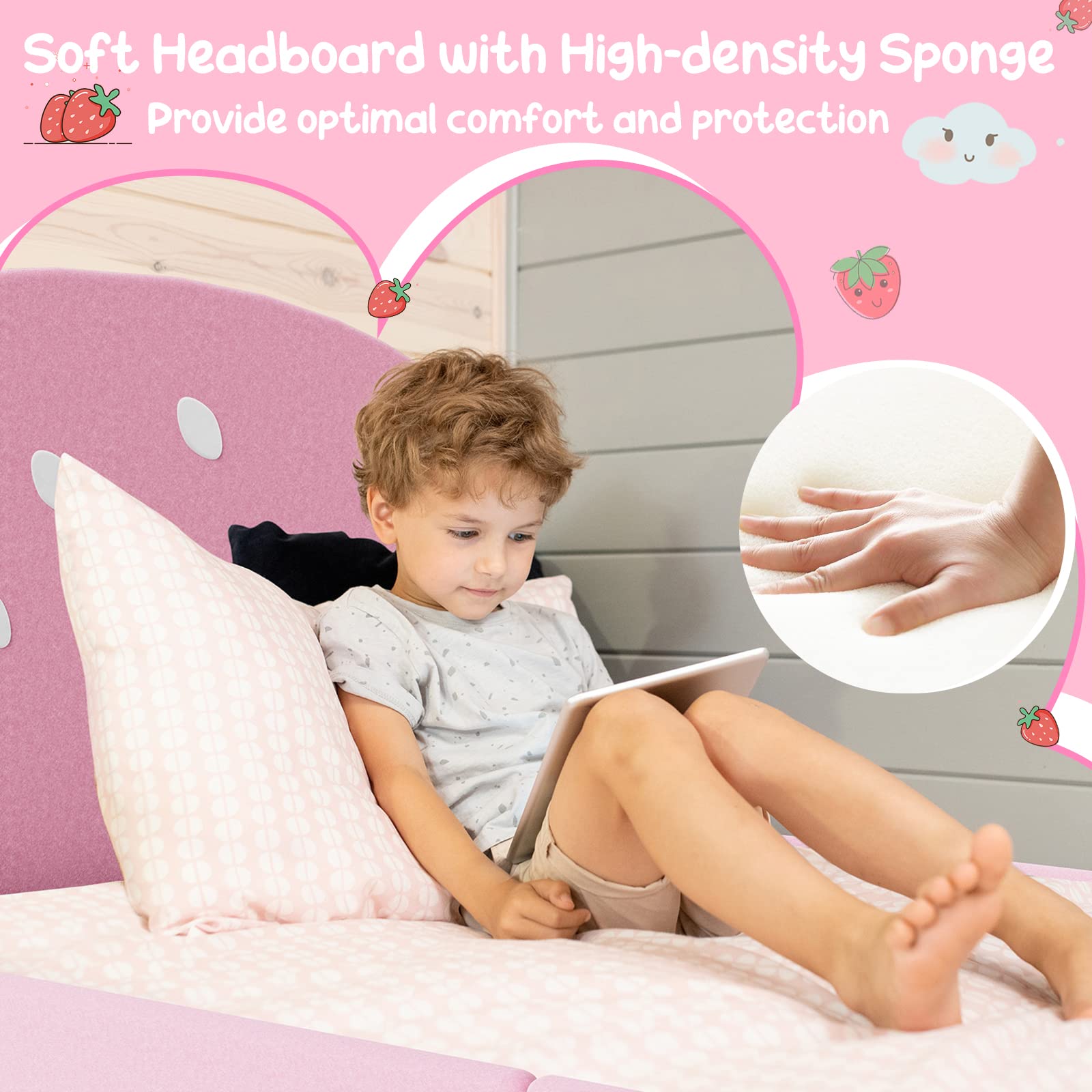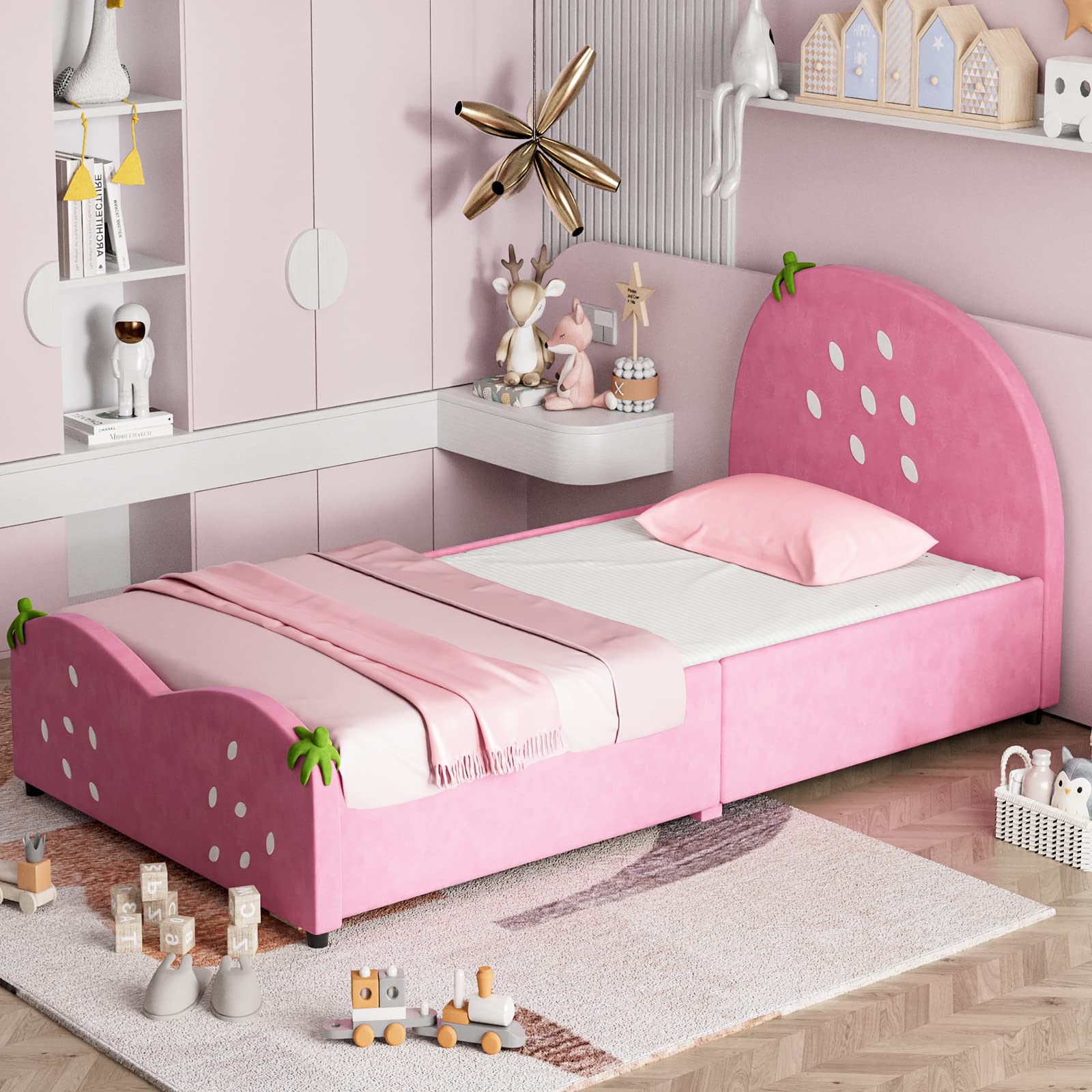- Strawberry Theme Design: Features a pink body with white polka – dots and green strawberry leaf accents on the headboard, footboard, and side rails.