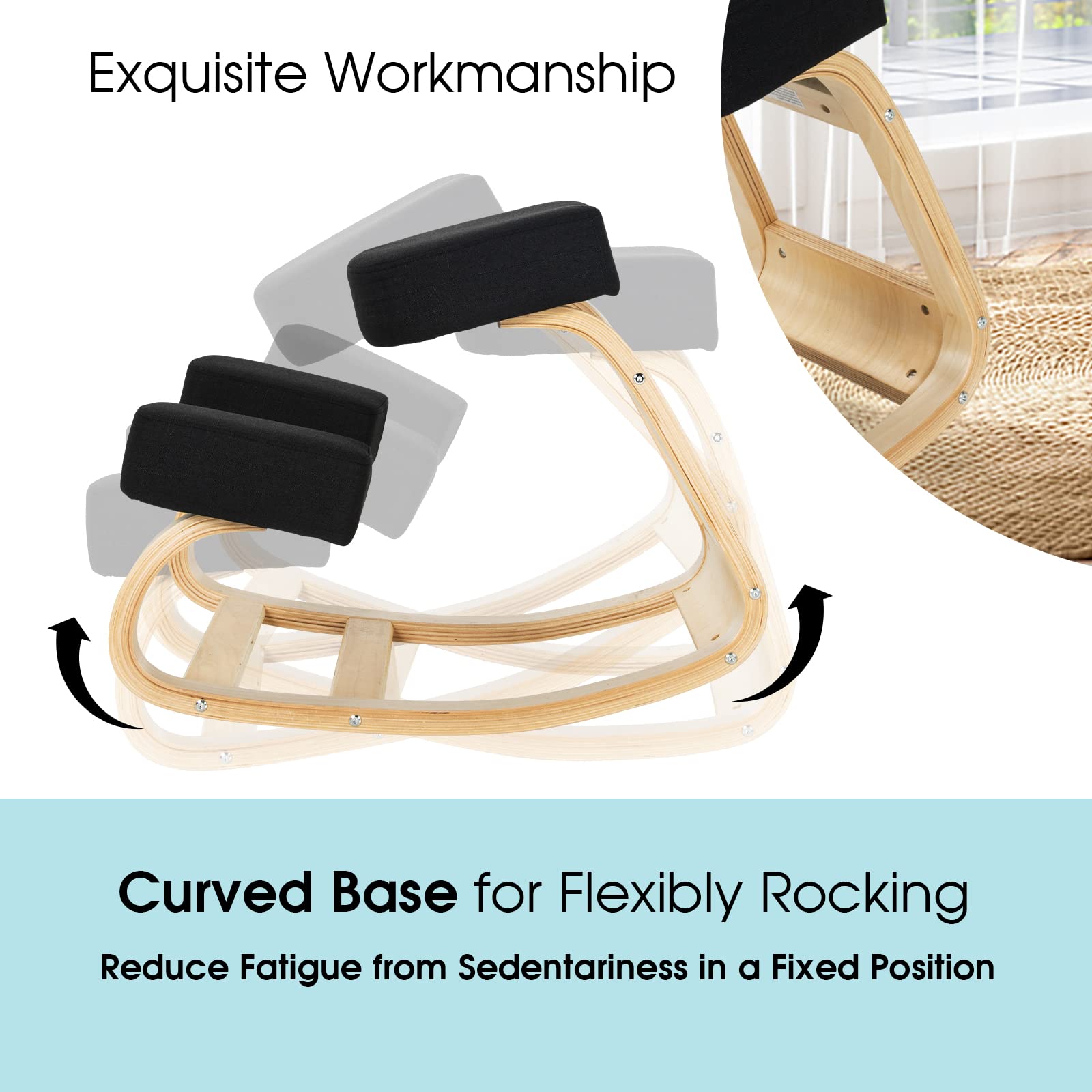 - Rocking function with a curved wooden base to reduce fatigue from static sitting