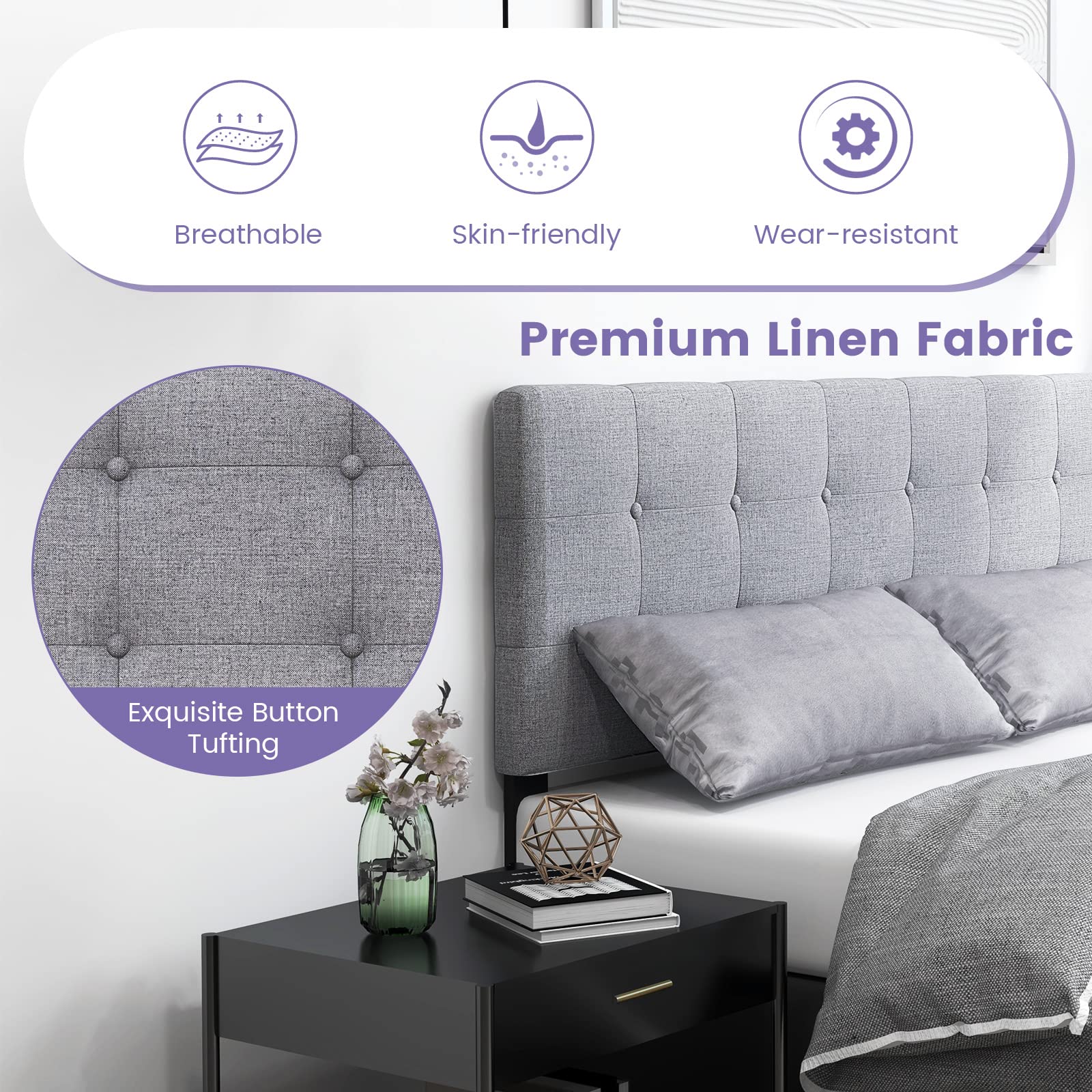 - Comfortable Upholstered Headboard: Covered by premium linen fabric, it is skin – friendly, breathable, and wear – resistant. Padded with a high – density sponge, it gives a soft touch and prevents bumping accidents.