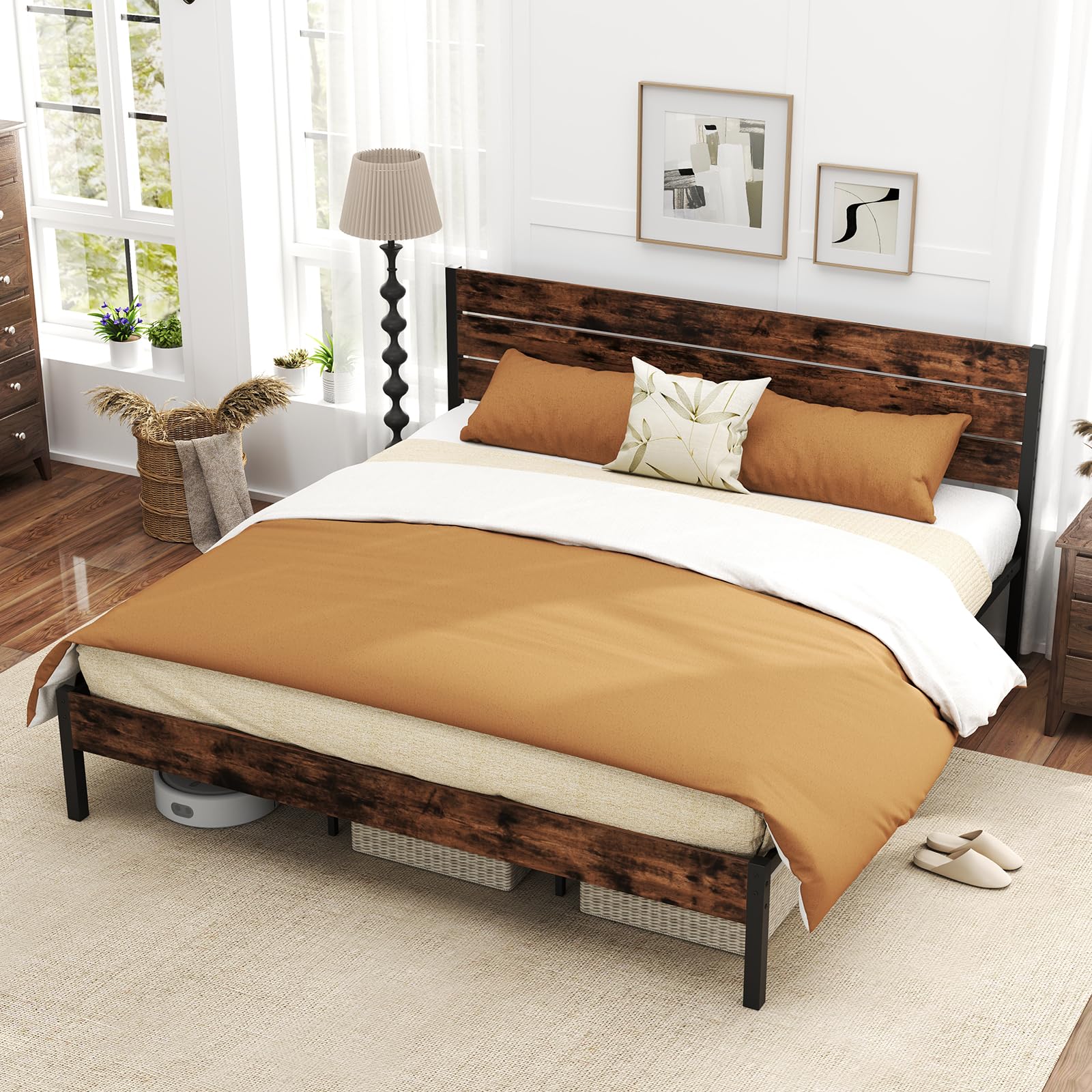 - No Box Spring Needed: Supported by 12 metal slats, suitable for mattresses 8”-12” thick.