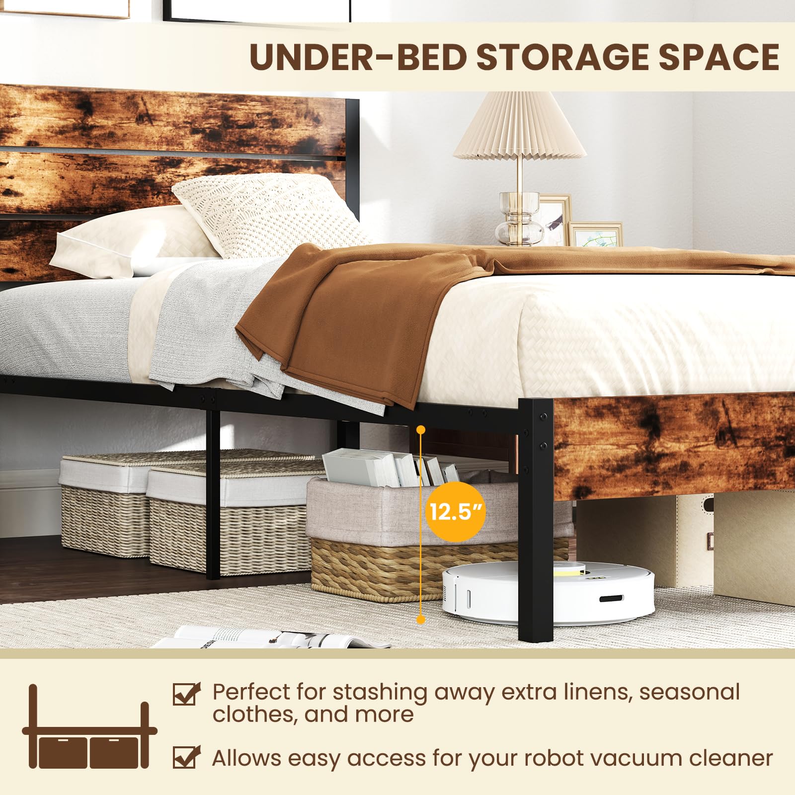 - Under – Bed Storage: 12.5 inches of clearance to fit baskets, bins, or a robot vacuum.