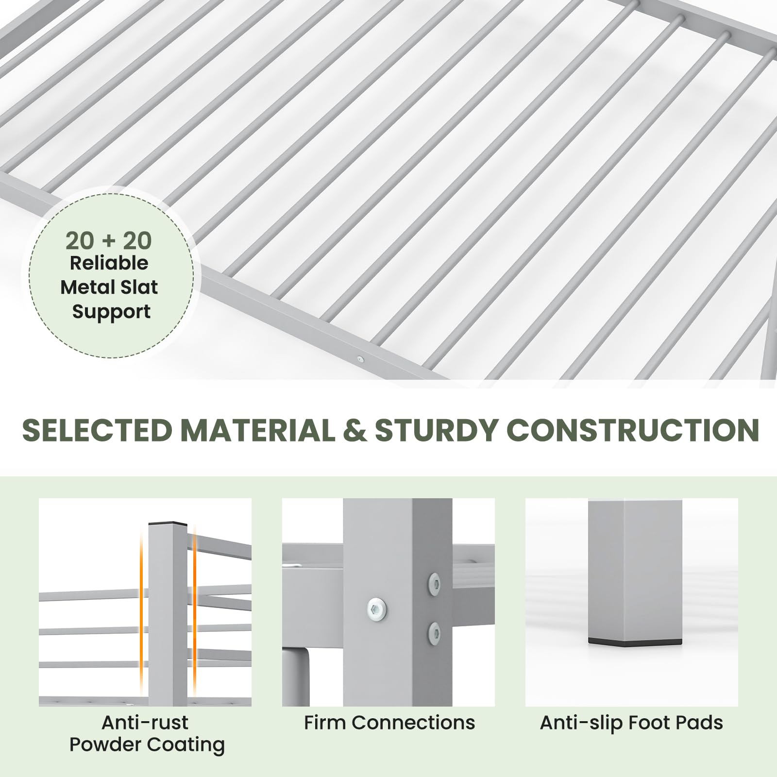 - 40 metal slats for stable mattress support, eliminating the need for a box spring.