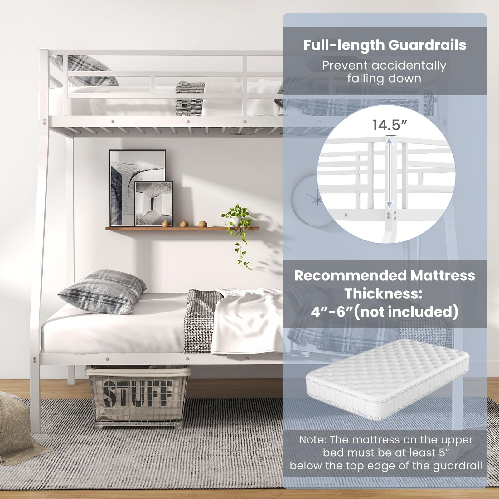 - Safety railings on the upper bed to prevent falls