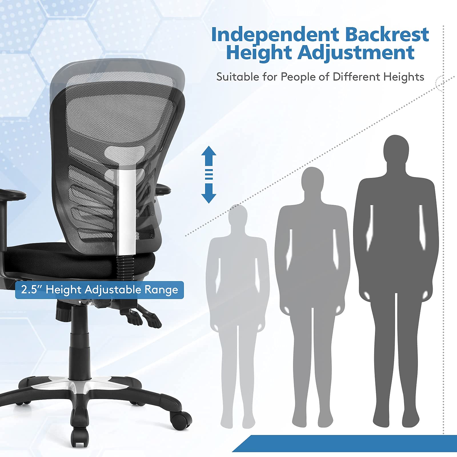 - Multiple adjustable features including seat height, backrest height, back tilt, seat tilt, and armrest height