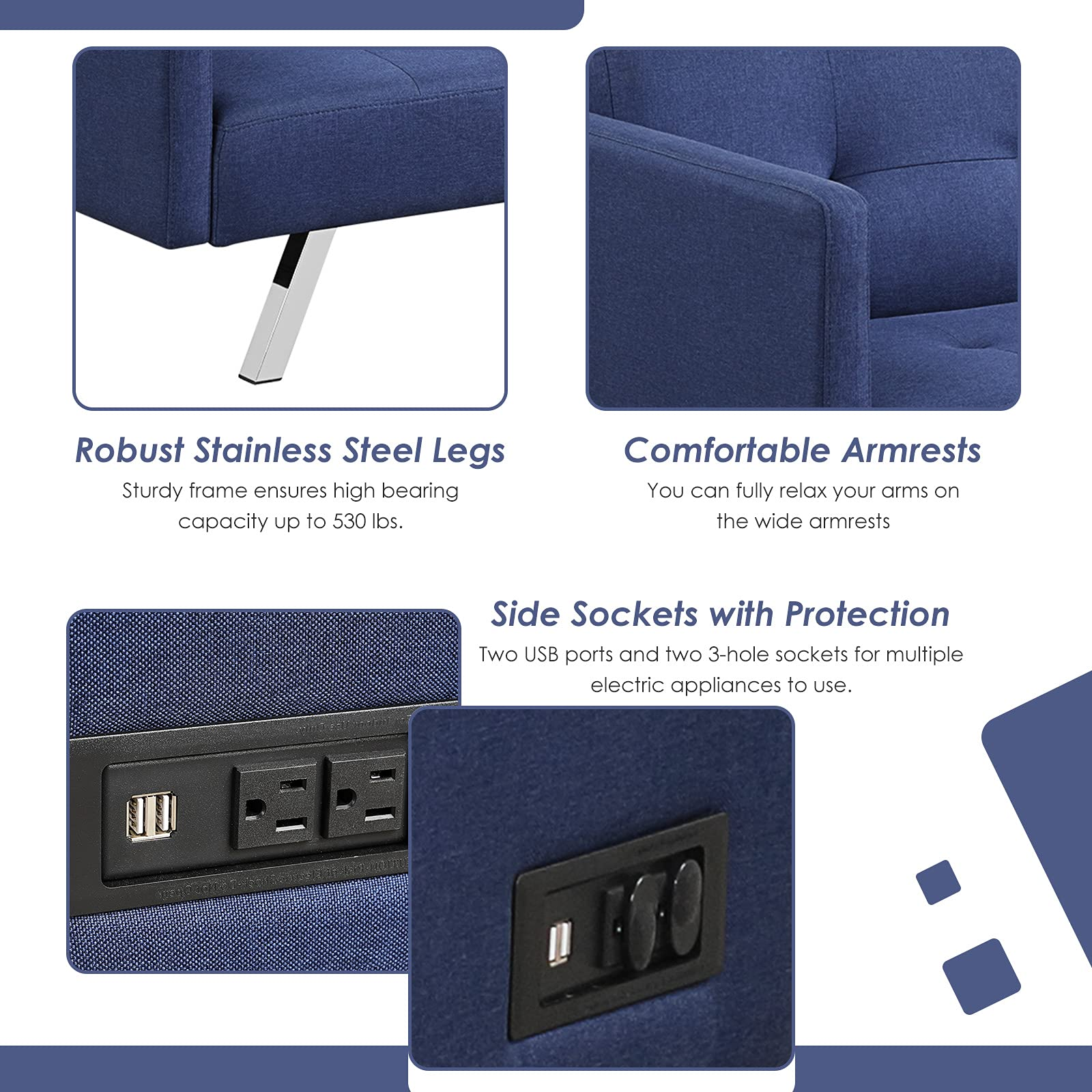- Convertible Sofa Bed: The backrest has 3 adjustable tilting degrees (105°, 155°, and 180°) and can be converted into an extra bed.