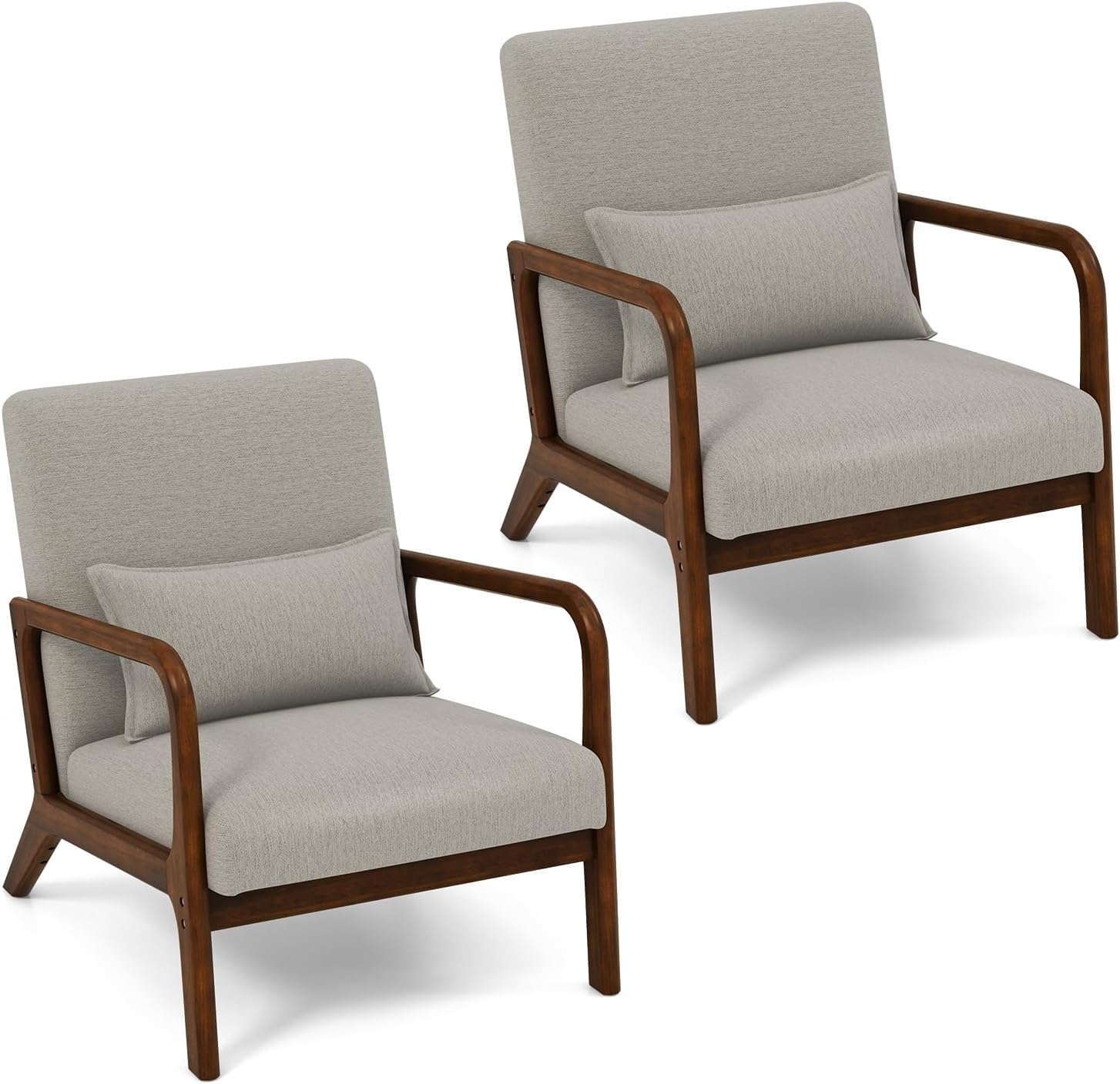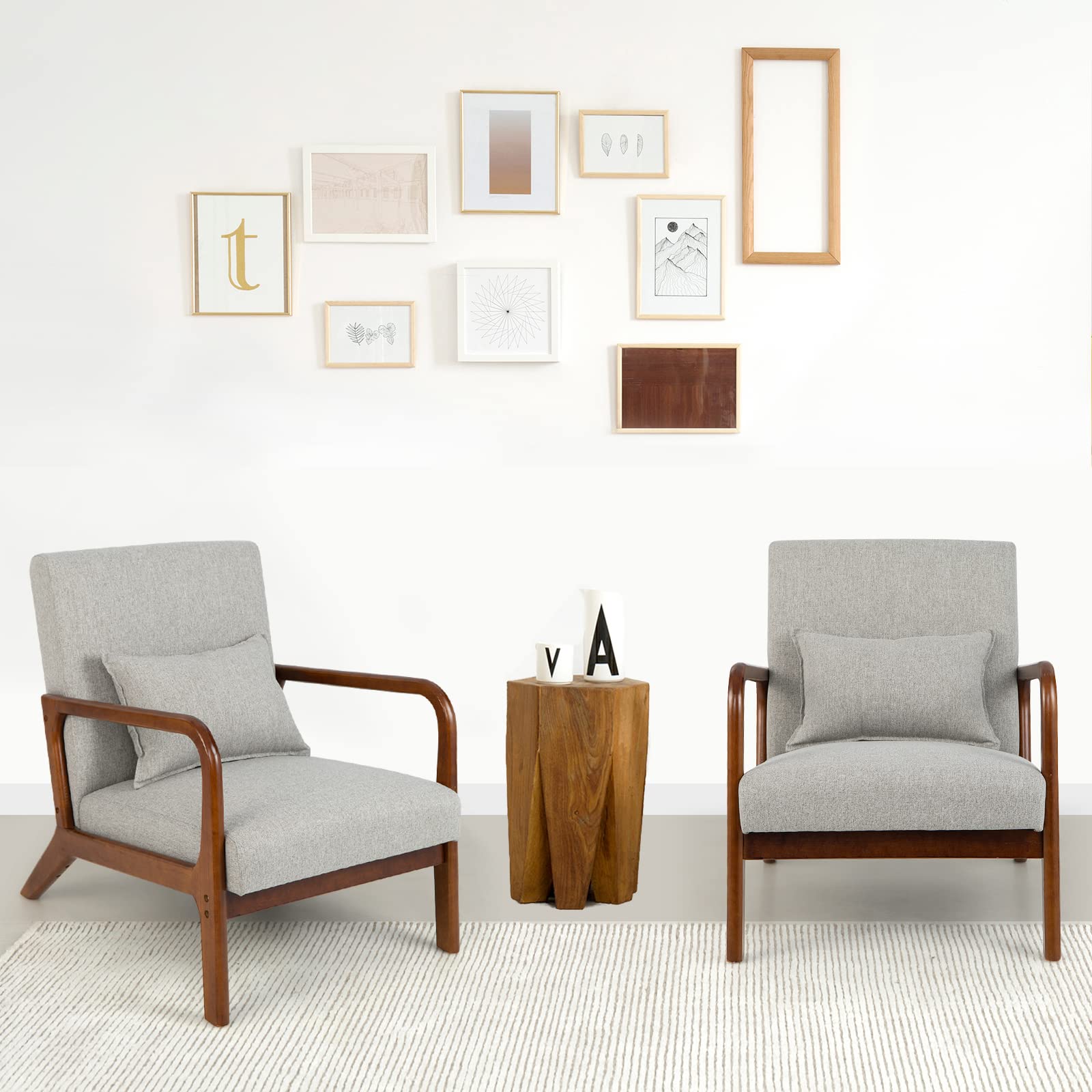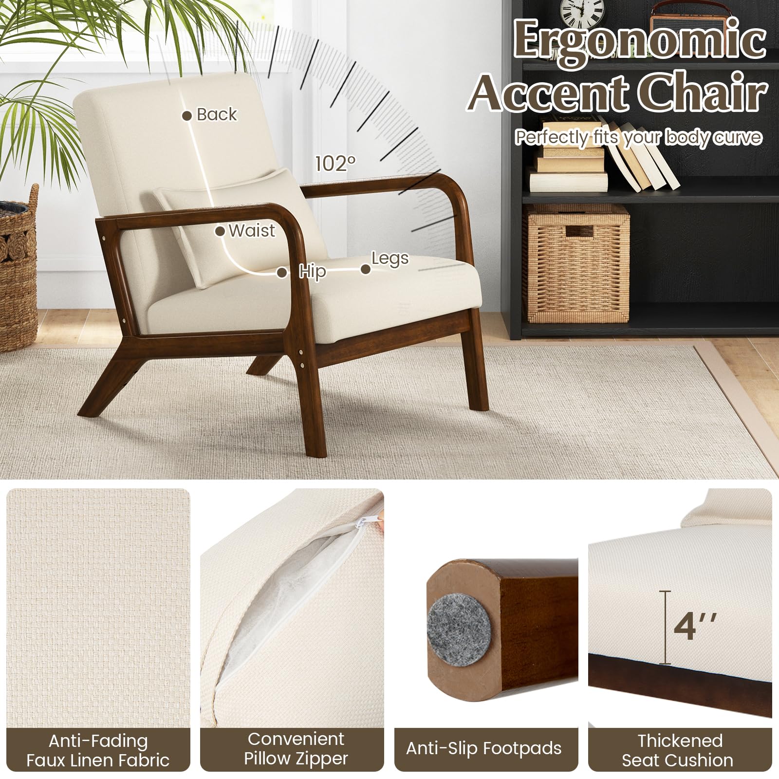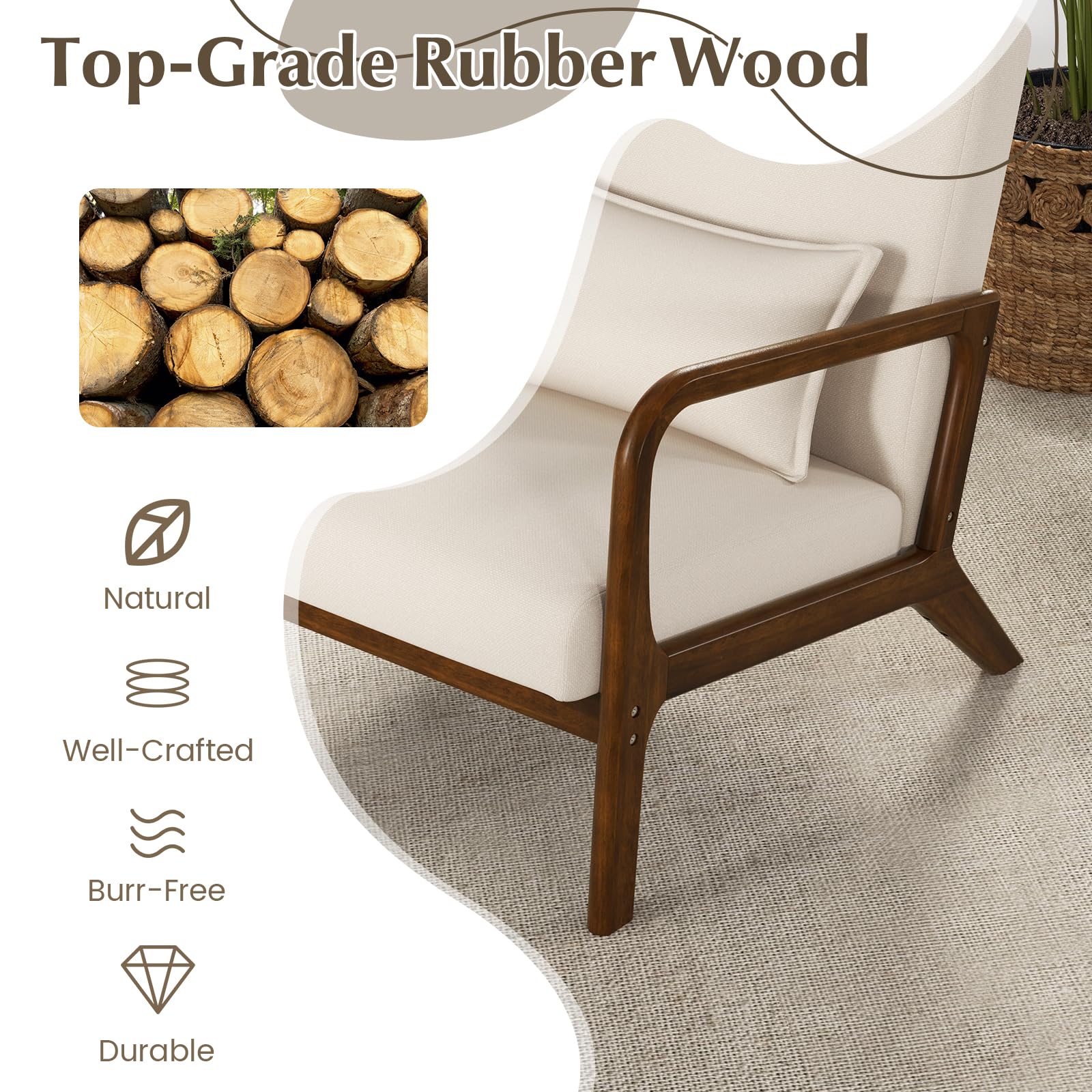This armchair is a perfect blend of comfort and style, designed for indoor use. It features a solid wood frame and light cream upholstery, along with a lumbar pillow for added coziness. Its minimalist design makes it a great accent piece for any room.