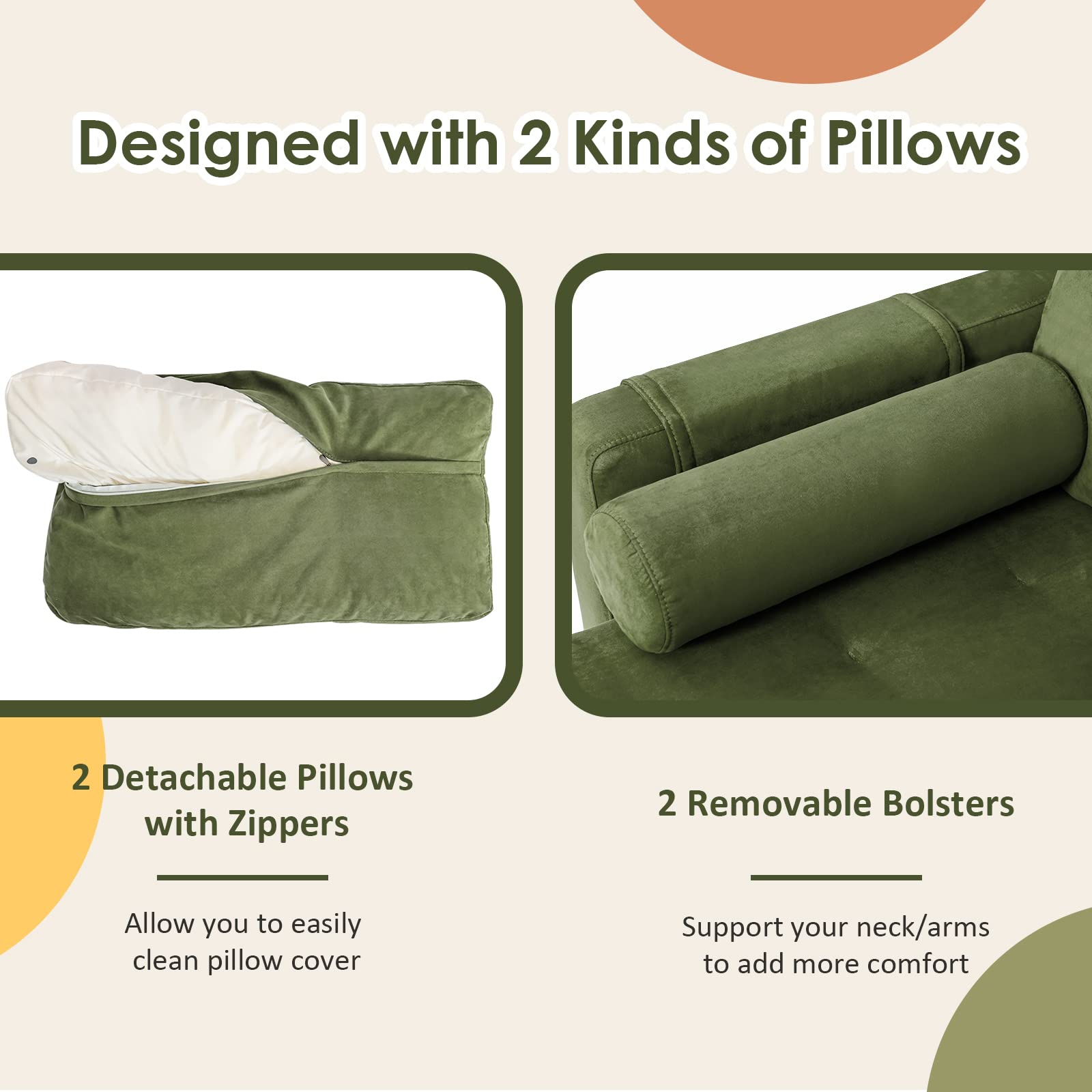 - Storage & Convenience: Removable pillows for cleaning/configuration, side bolsters, and side pockets on armchairs for storing small items.
