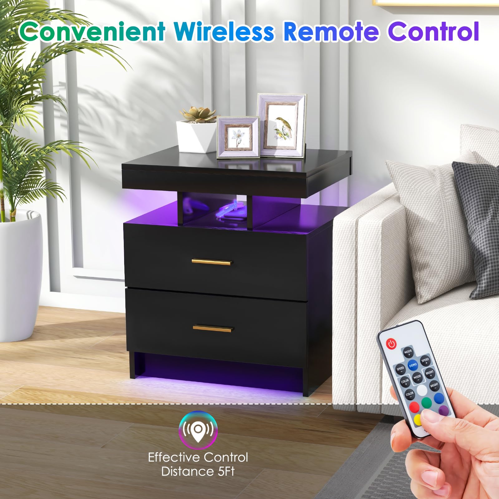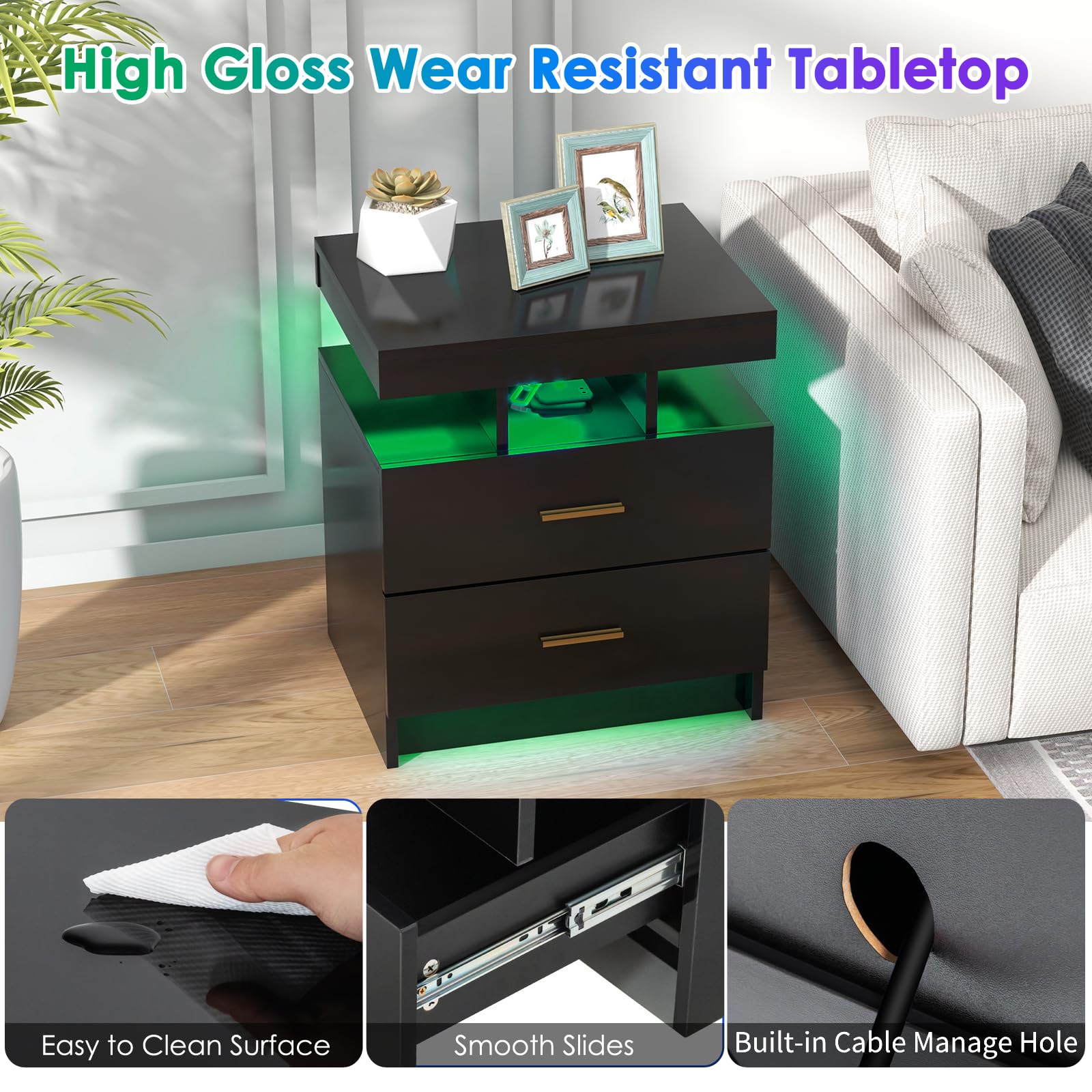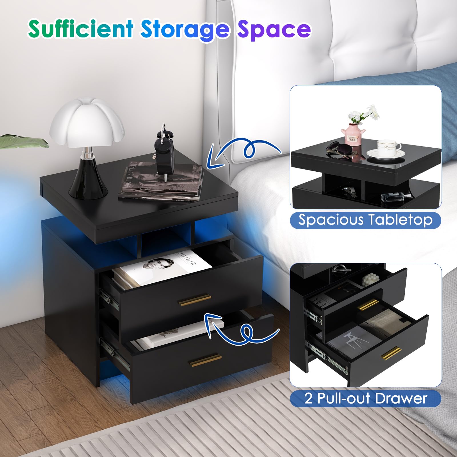 This is a modern bedside table designed for bedroom use. It comes with integrated LED lighting, storage drawers, and an open upper shelf, offering both functionality and a sleek aesthetic.