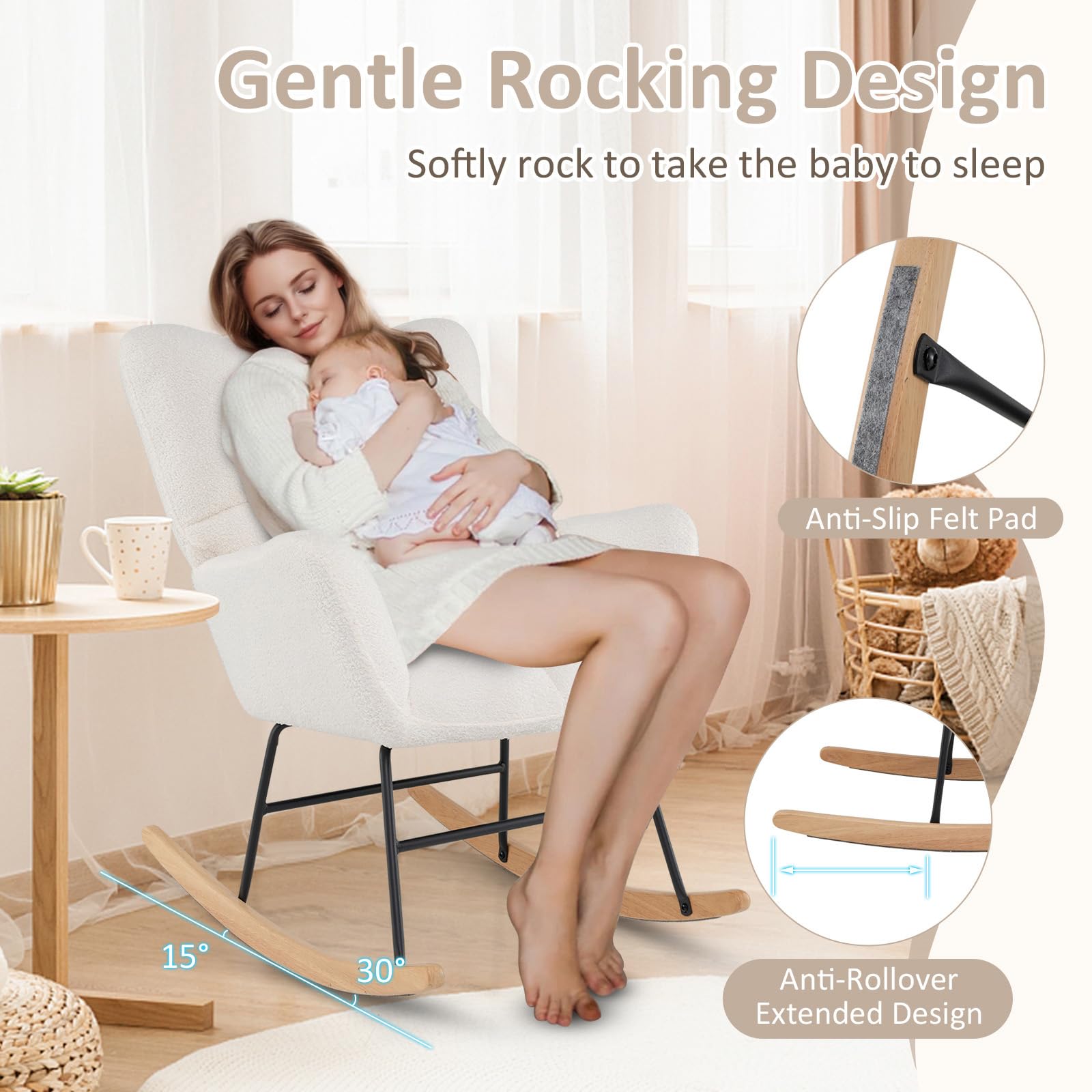- Gentle rocking mechanism with a 15°–30° angle range, anti – slip felt pads, and anti – rollover extended design