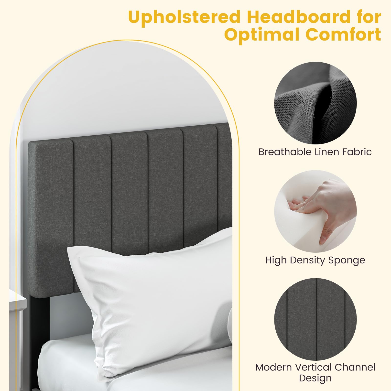 - Upholstered Headboard for Optimal Comfort: The headboard is upholstered in breathable linen fabric with good tactility and a skin – friendly touch. Filled with high – density sponge, it’s comfortable to lean against.