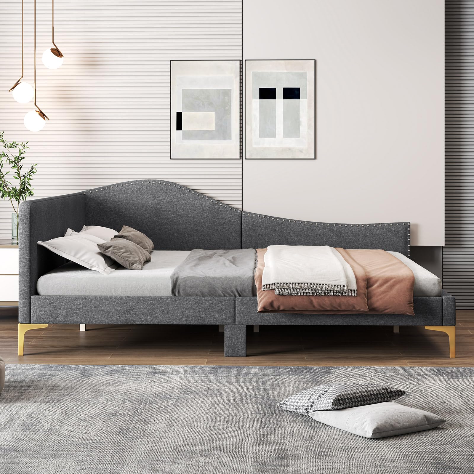 - Nailhead trim, curved headboard, and gold – toned metallic legs add a refined and modern look.