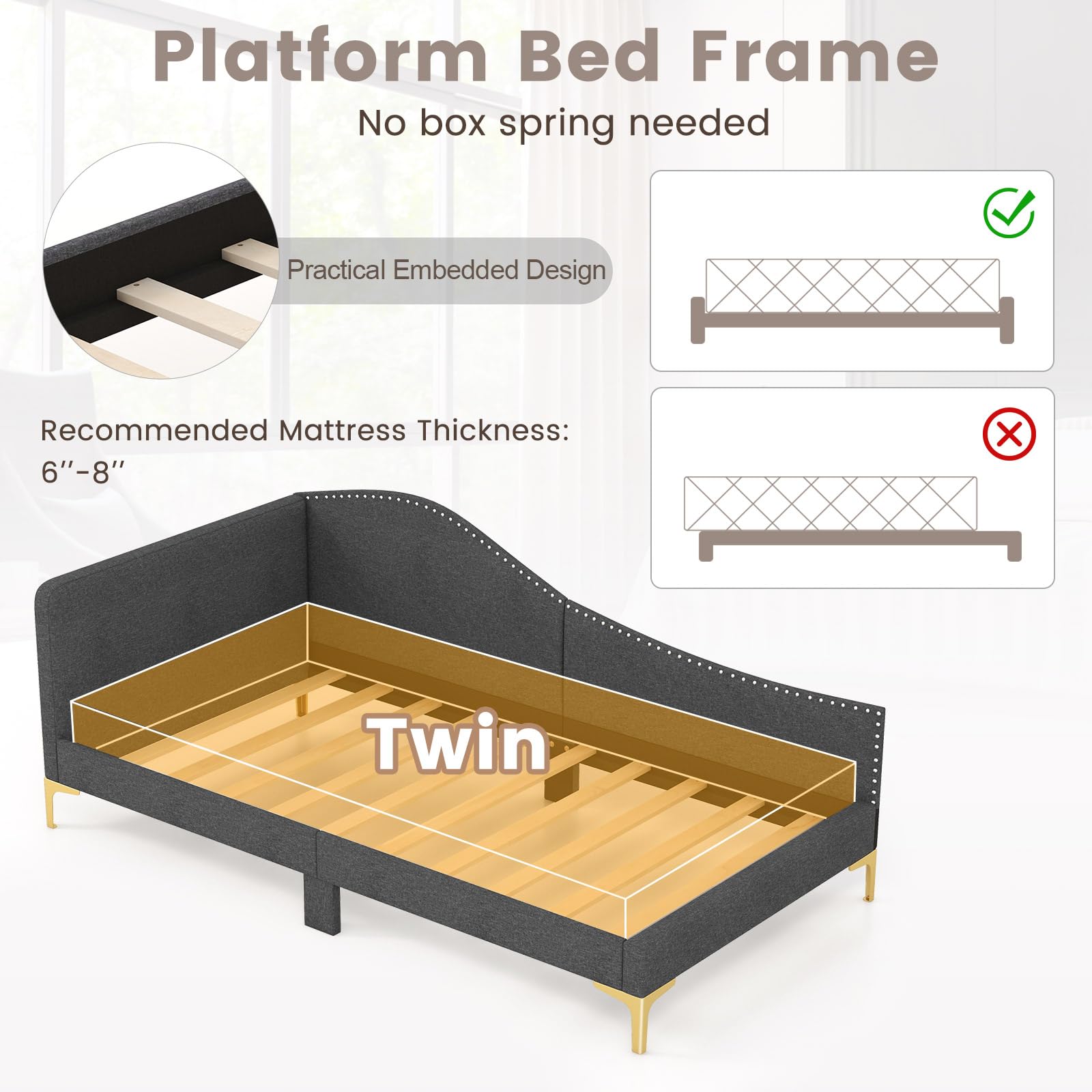- Sturdy wooden slats provide excellent mattress support without the need for a box spring.