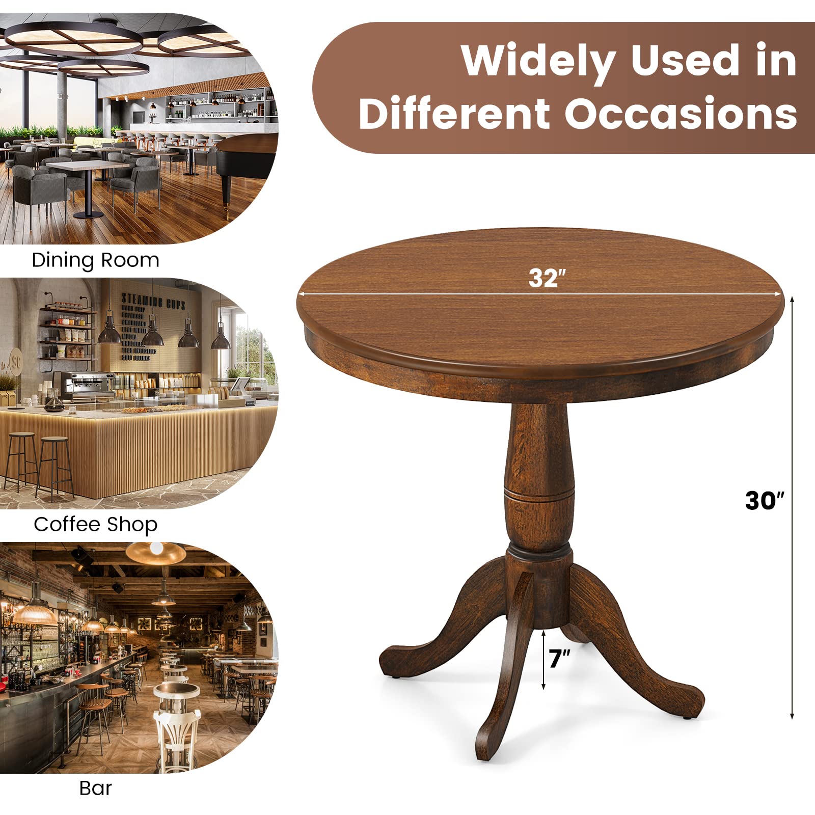 Casual dining, small gatherings in dining rooms, kitchen nooks, coffee shops, bars. Also as a decorative accent table in living rooms or entryways.