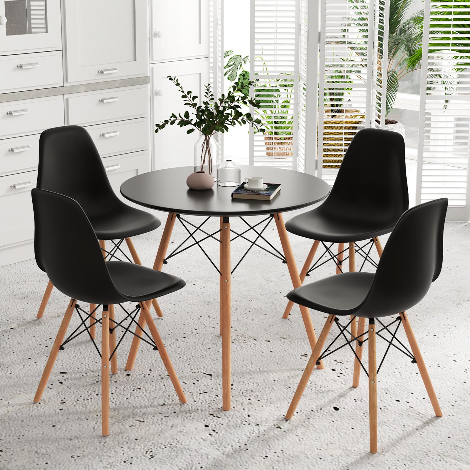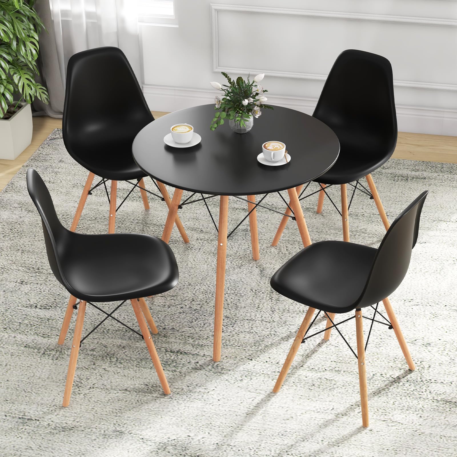This 5 – piece round dining table set is a perfect addition for small spaces. It combines functionality with style, featuring a round table and four chairs. The set’s design is versatile, suitable for various settings.