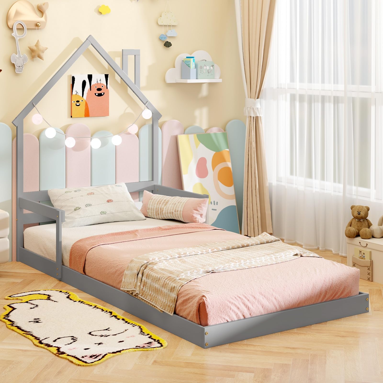 - Playful house – shaped headboard with a chimney, adding a fun and imaginative touch to the room.