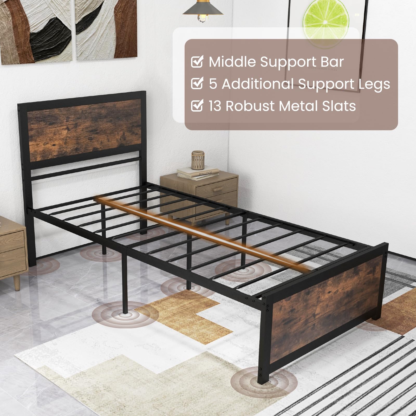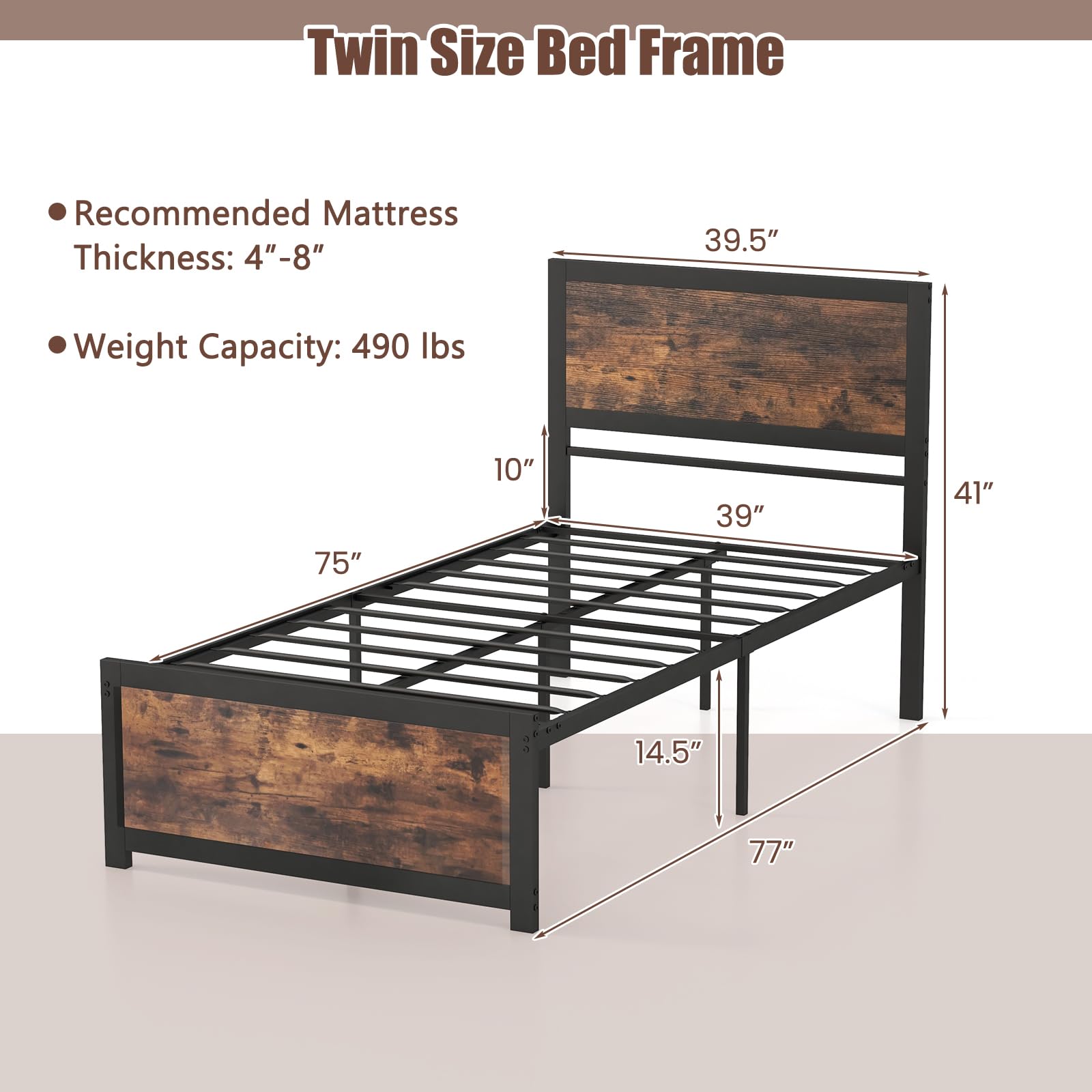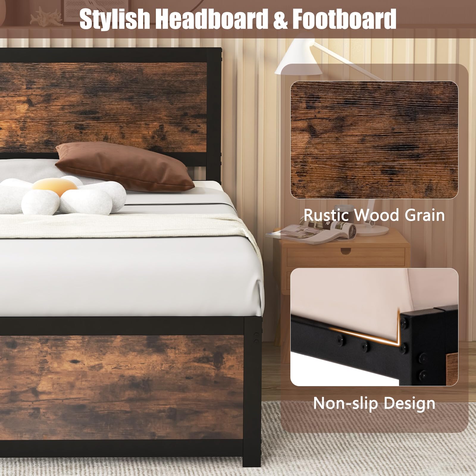 This twin-size bed frame is a great addition to any bedroom. It combines the sturdiness of a metal frame with the rustic charm of wood-look panels. The frame provides stable support for your mattress and offers convenient under-bed storage.