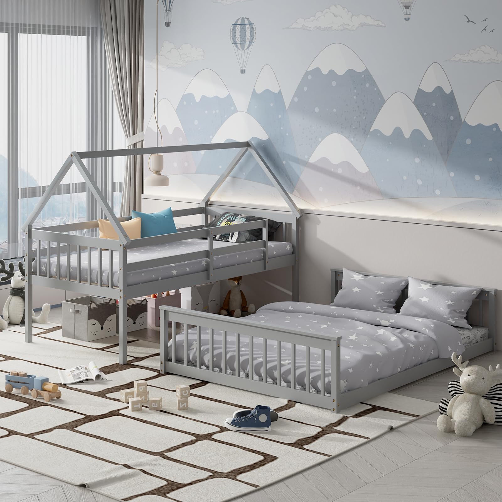 - 2 – in – 1 Design for Saving Space: Consists of 2 twin bed frames to maximize limited space, can be used as a bed or a sofa, and 2 single beds for guests.