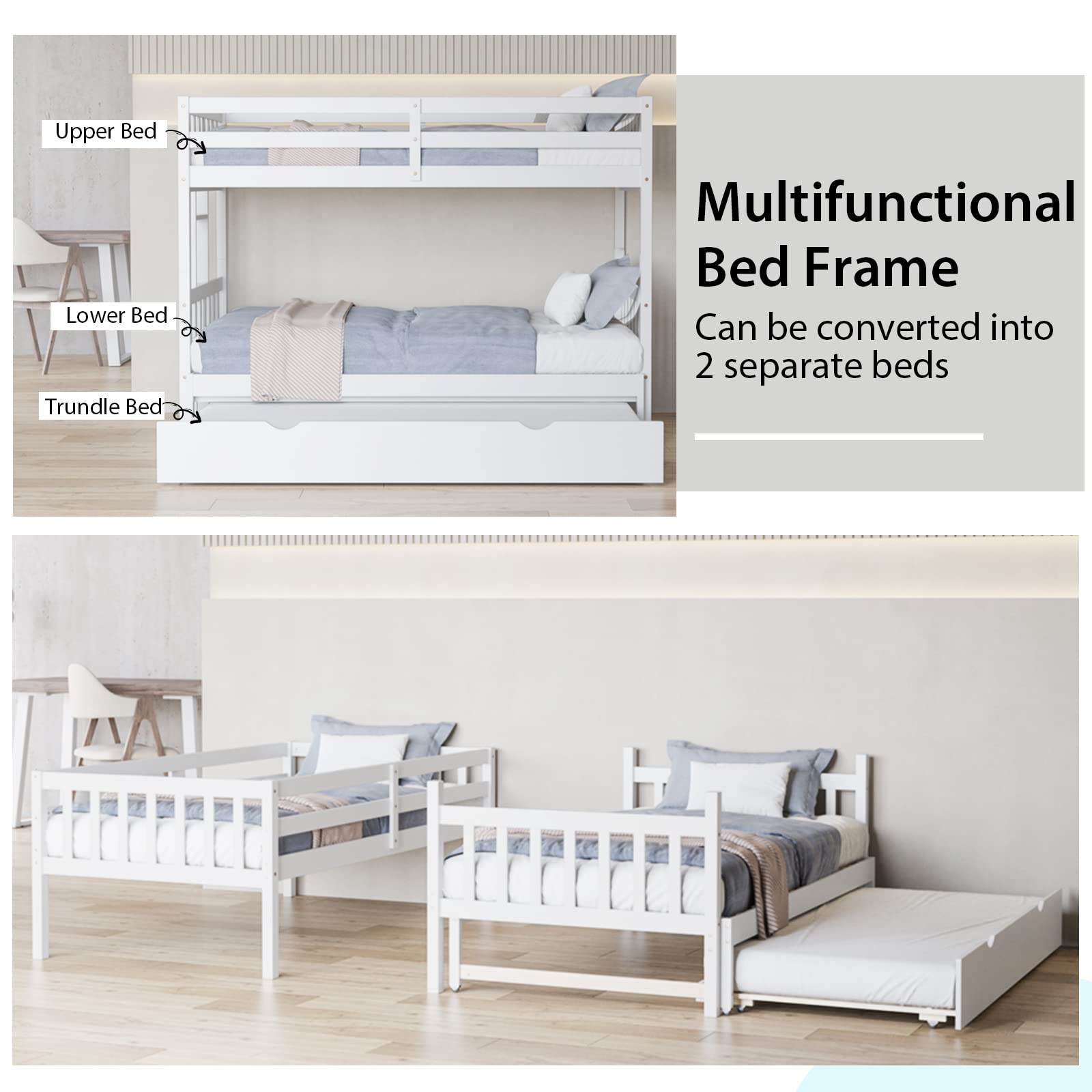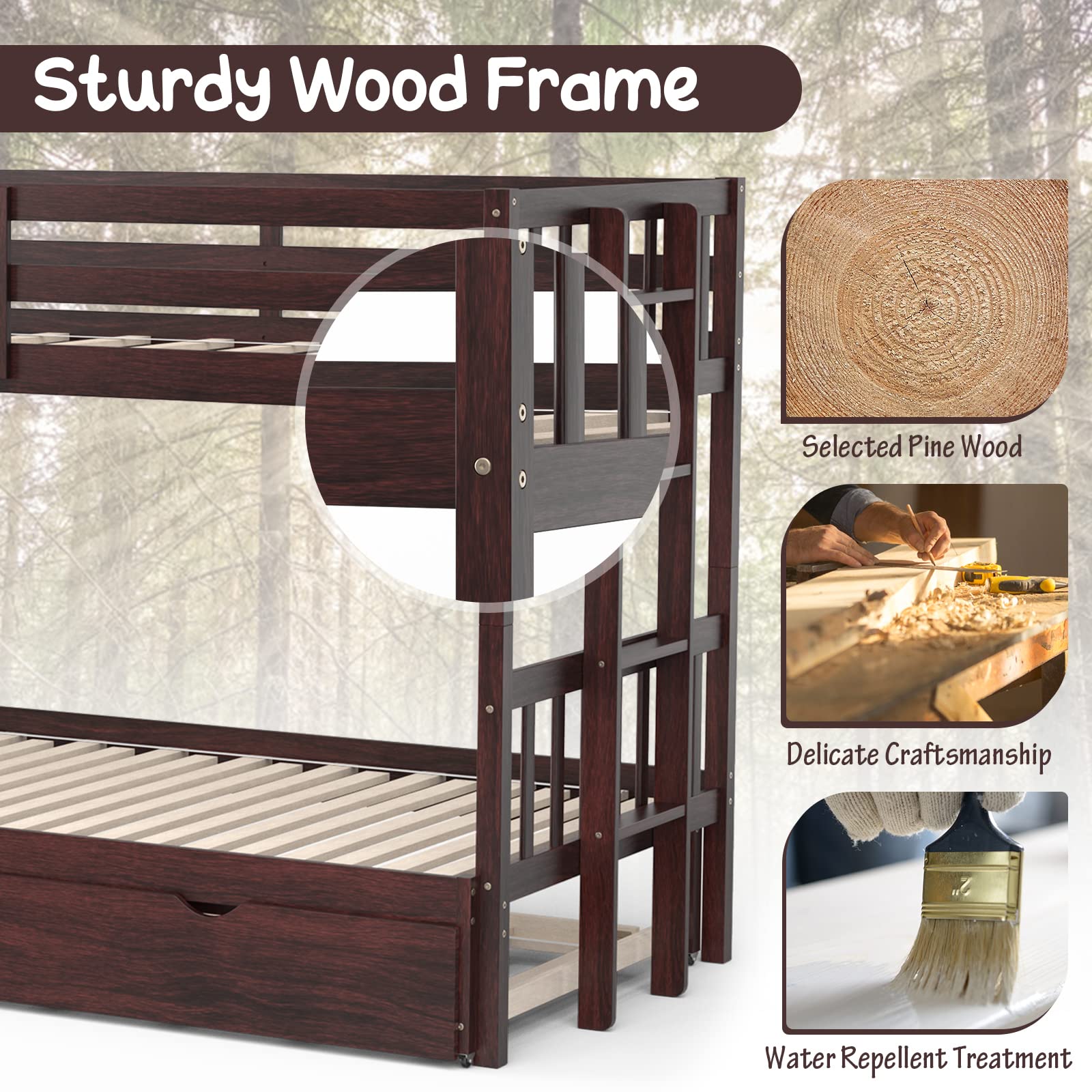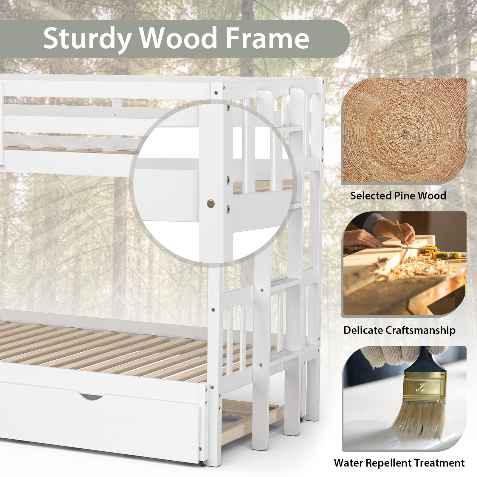 - Pull – out trundle drawer with noise – free, smooth wheels for easy storage