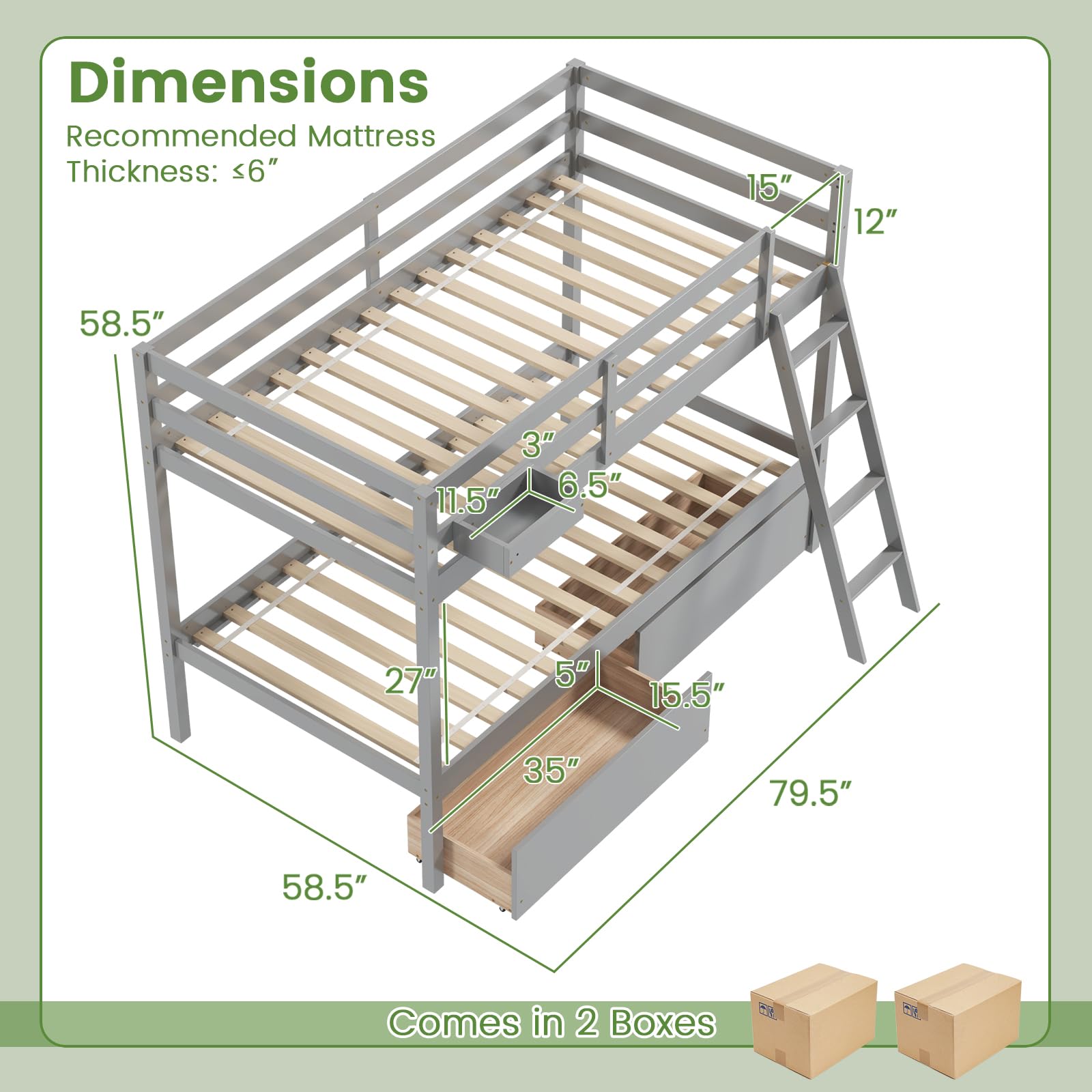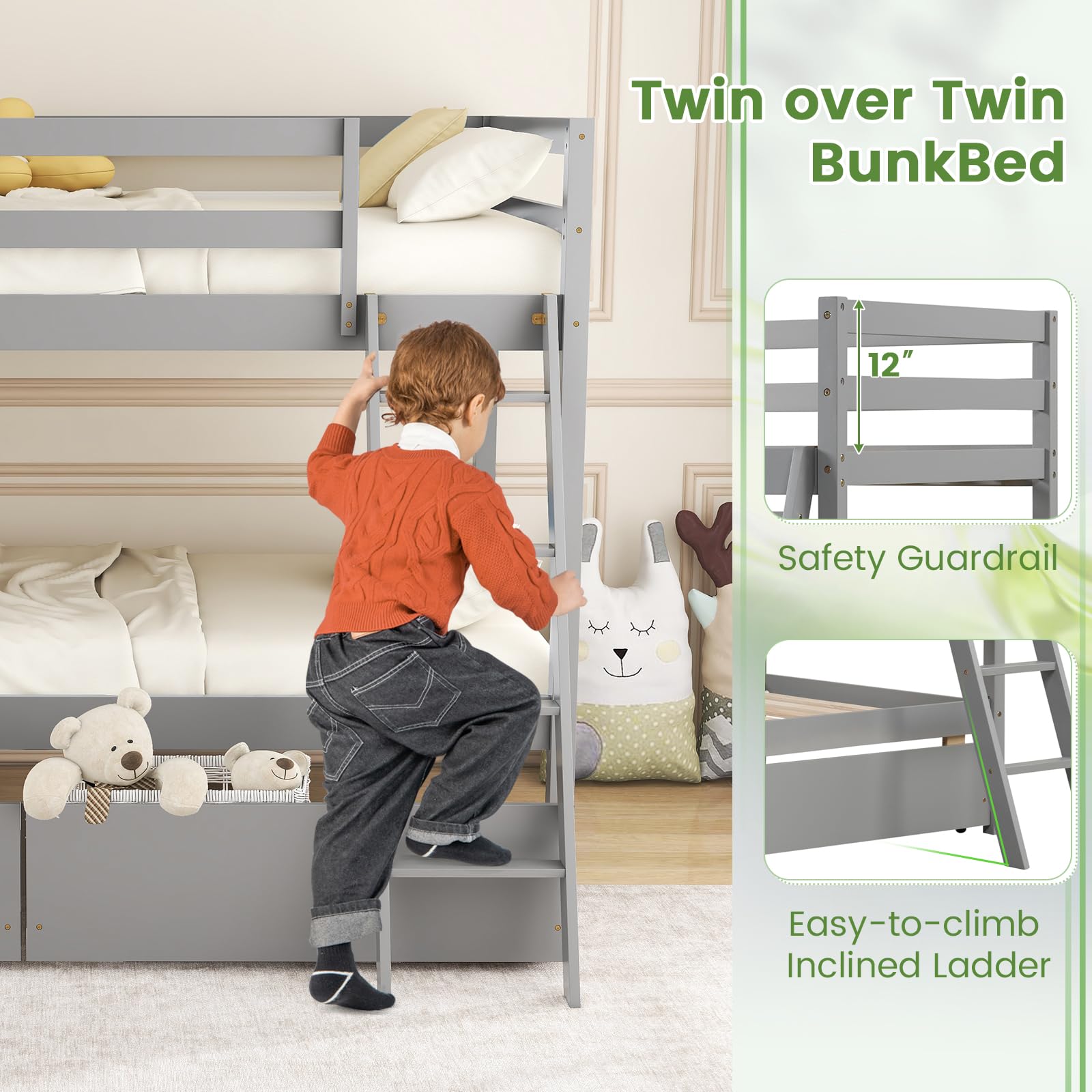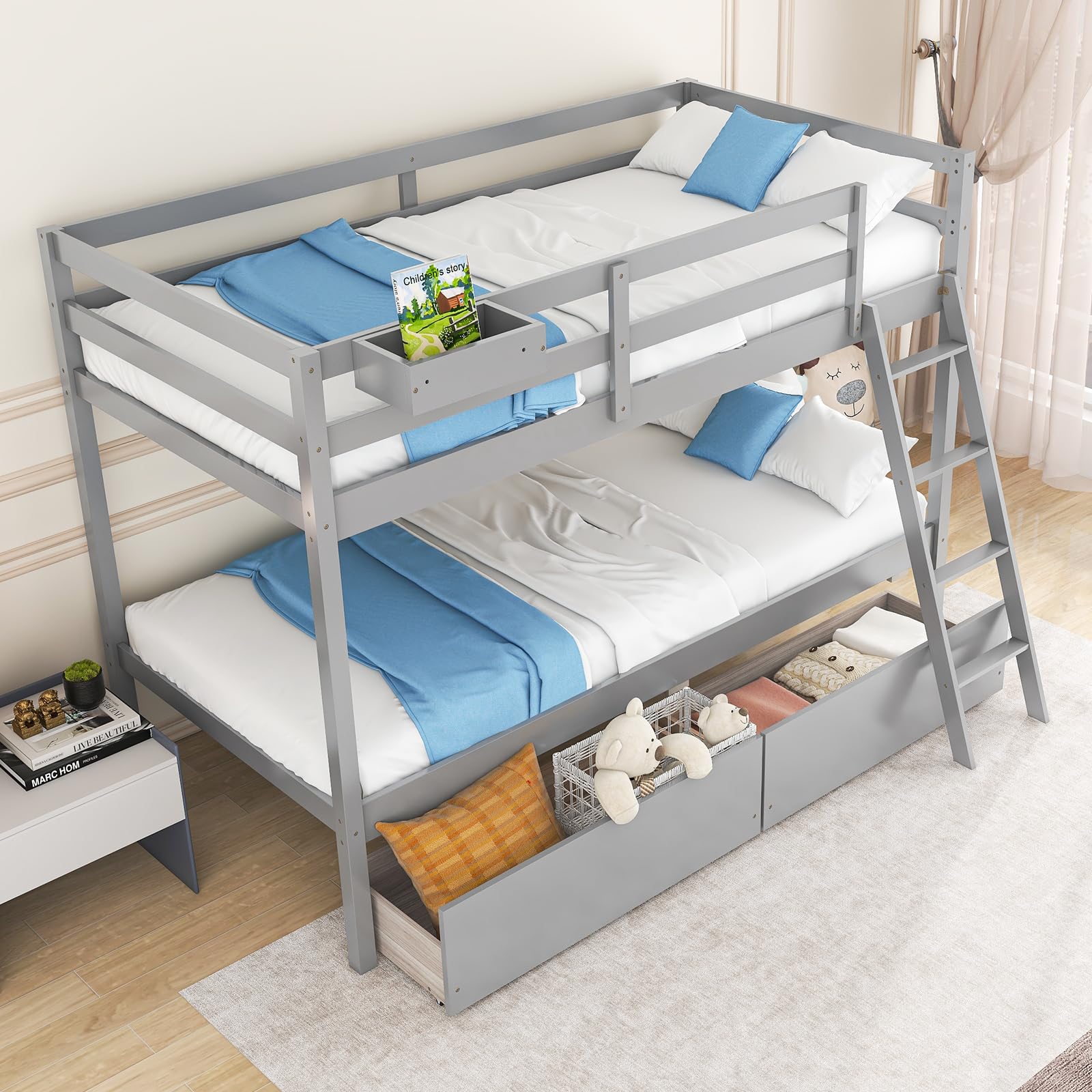 - Two large storage drawers below the lower bunk with smooth rolling casters
