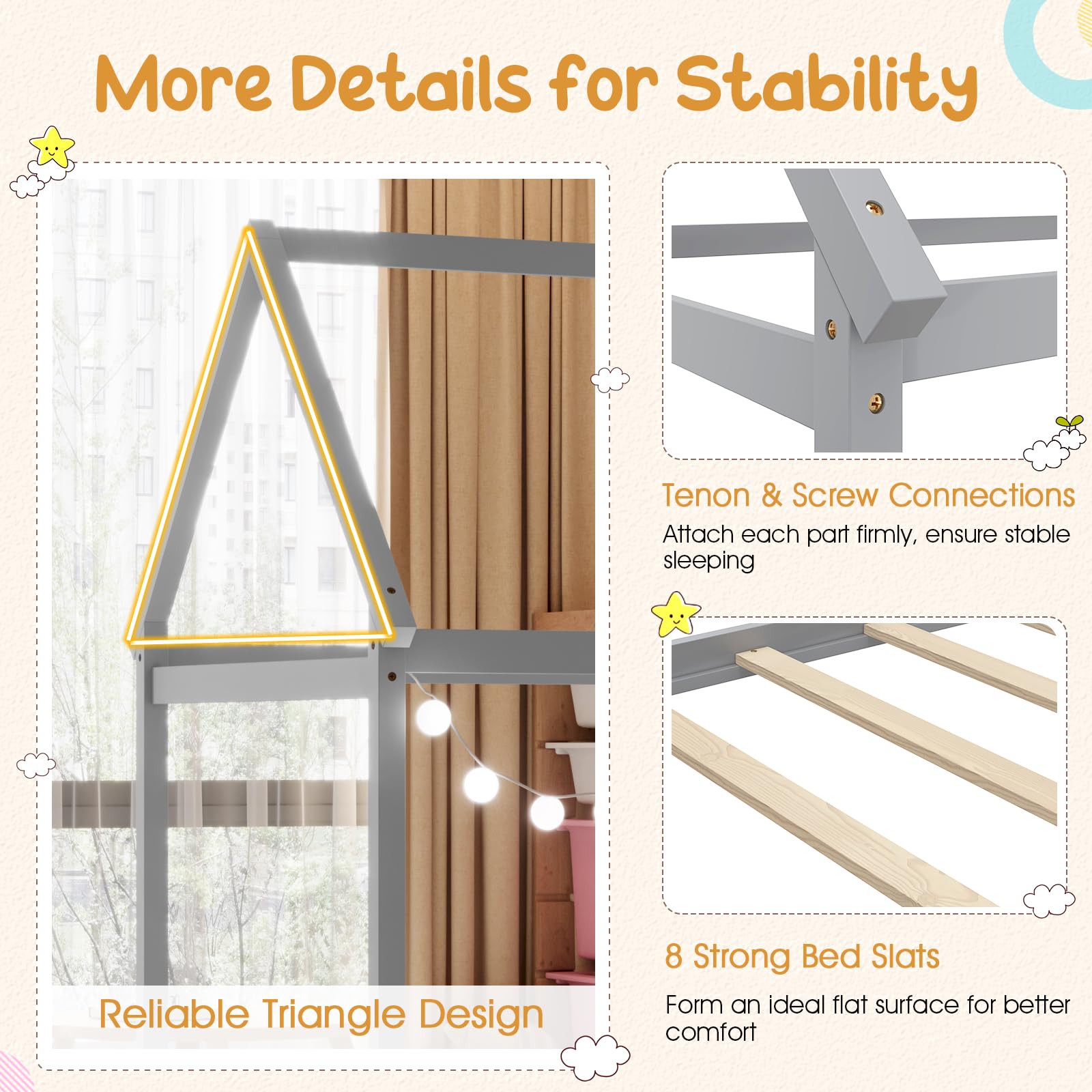 - Adorable Design: The house – shaped eaves add an exciting element of fun to the room.