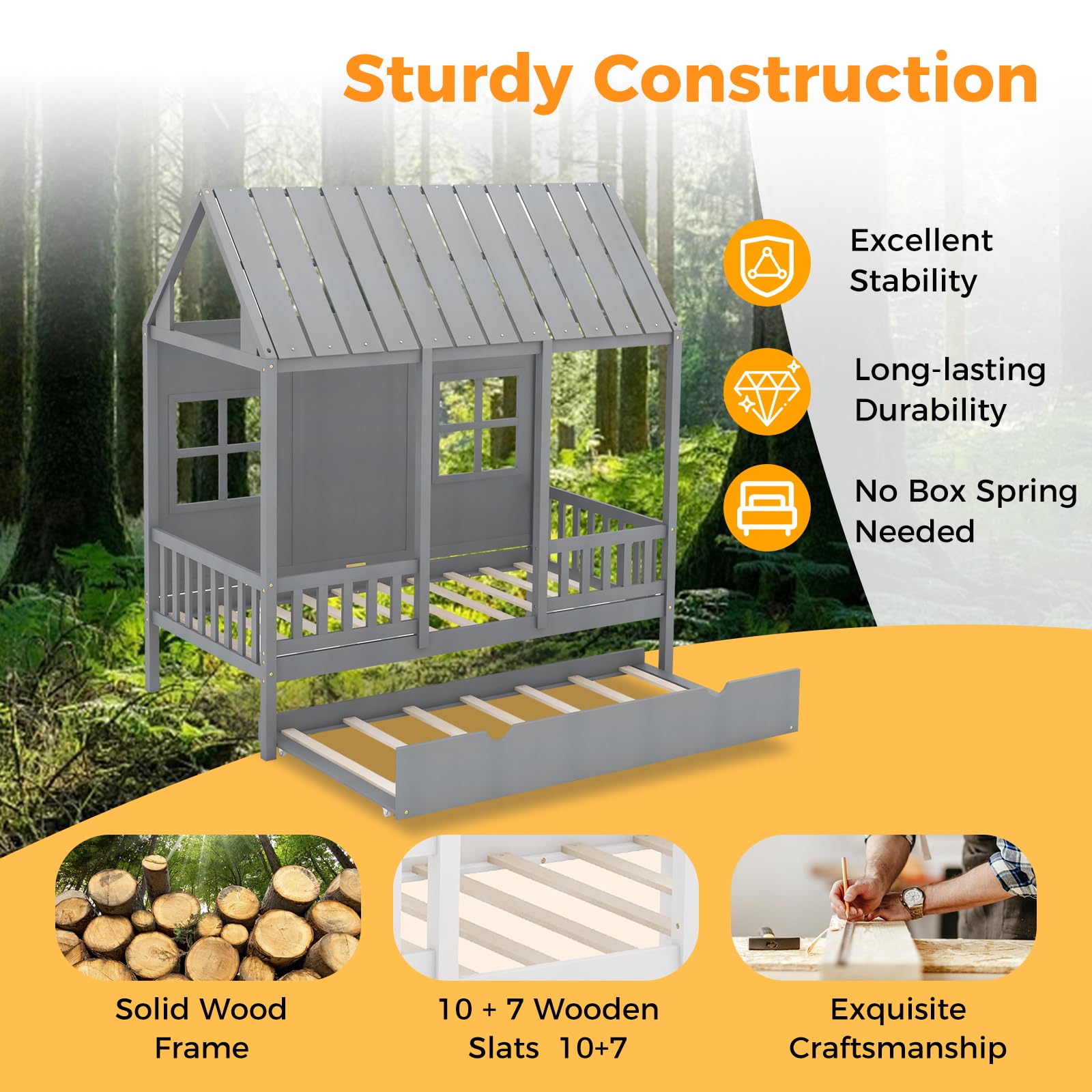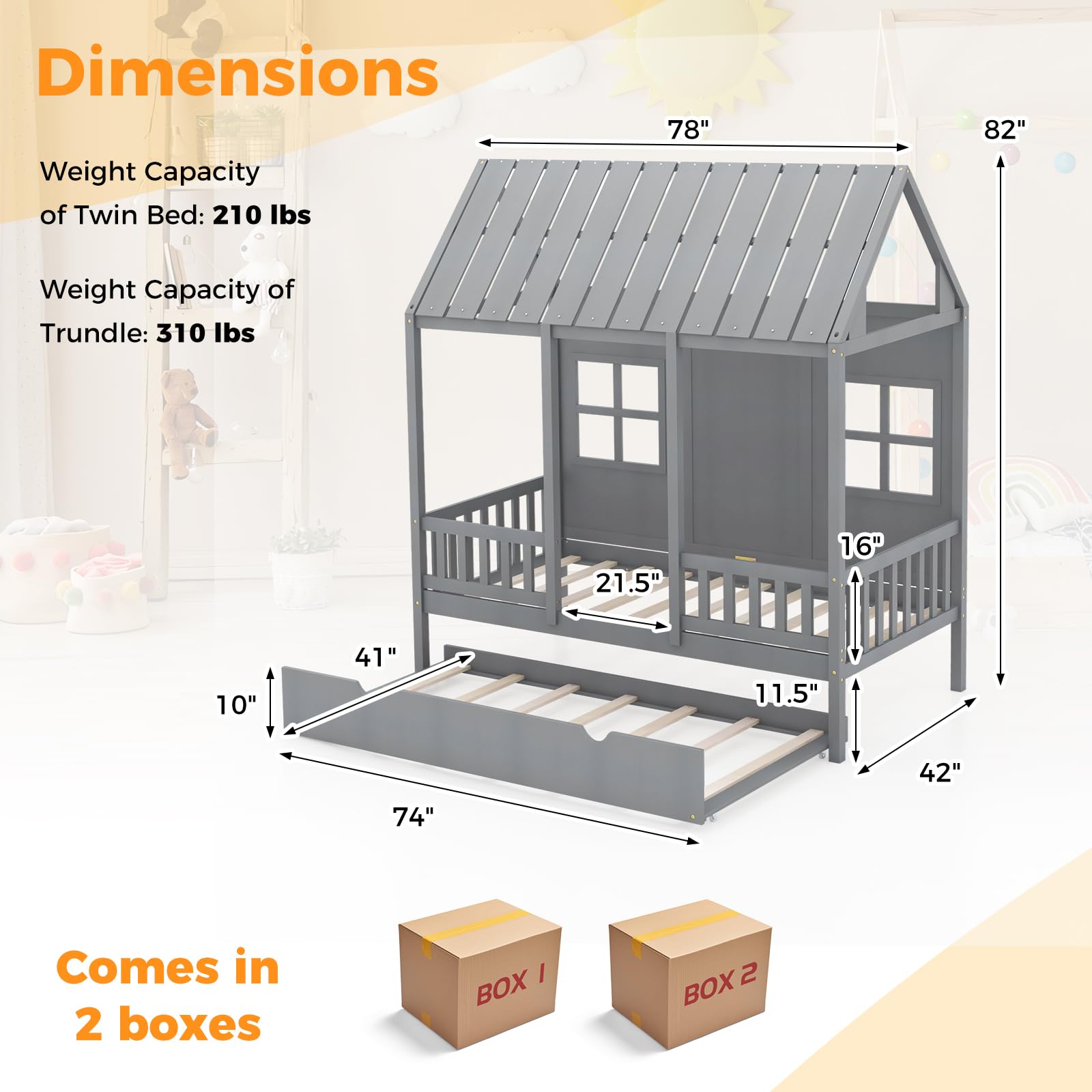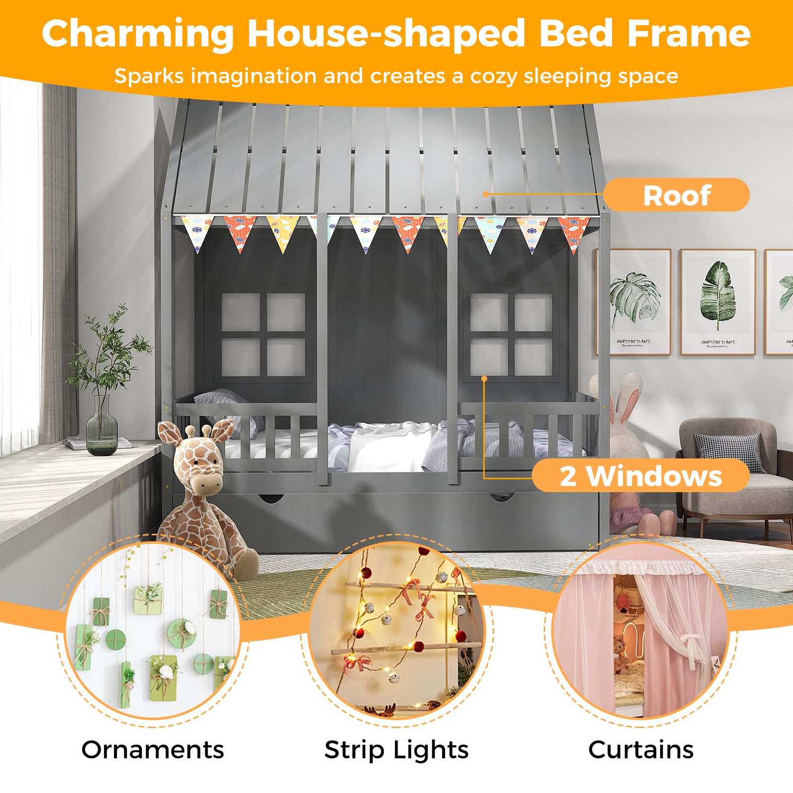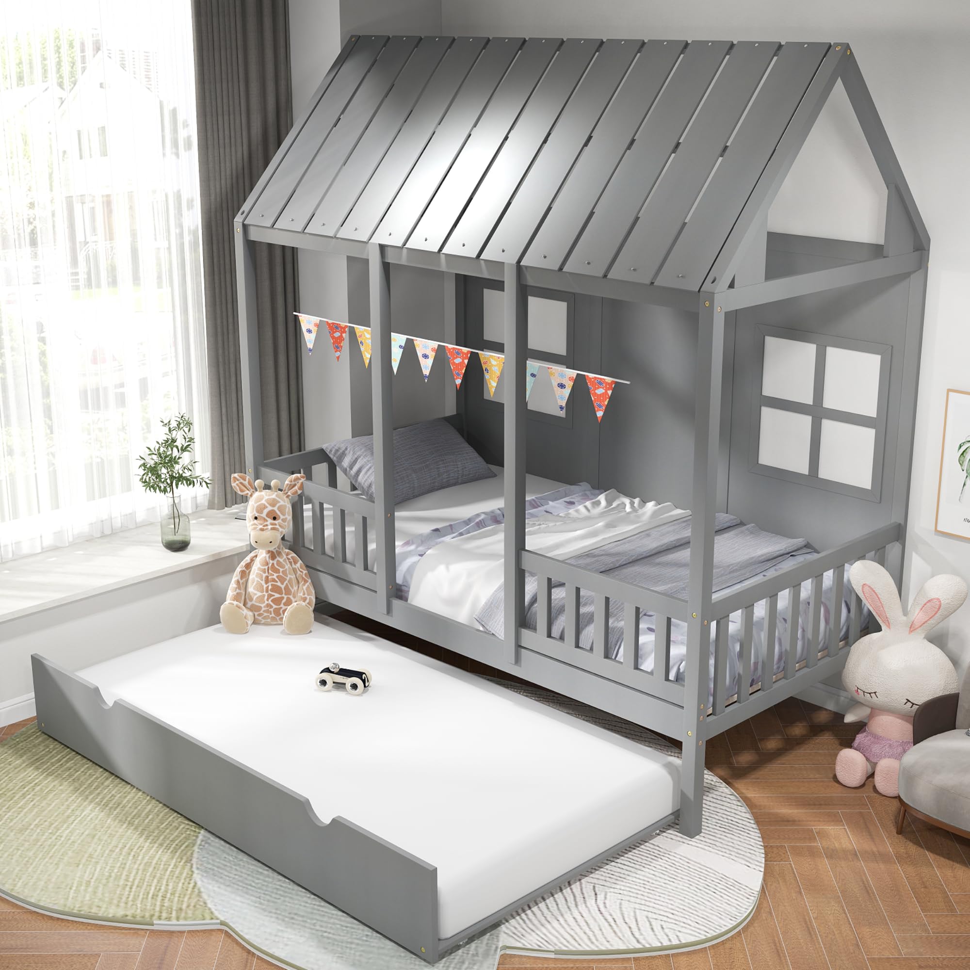 This is a children’s house-shaped bed frame that combines functionality with a playful design. It comes with a twin-size main bed and an attached trundle bed, offering extra sleeping or storage space. The bed is perfect for creating an imaginative and cozy bedroom setup for kids.