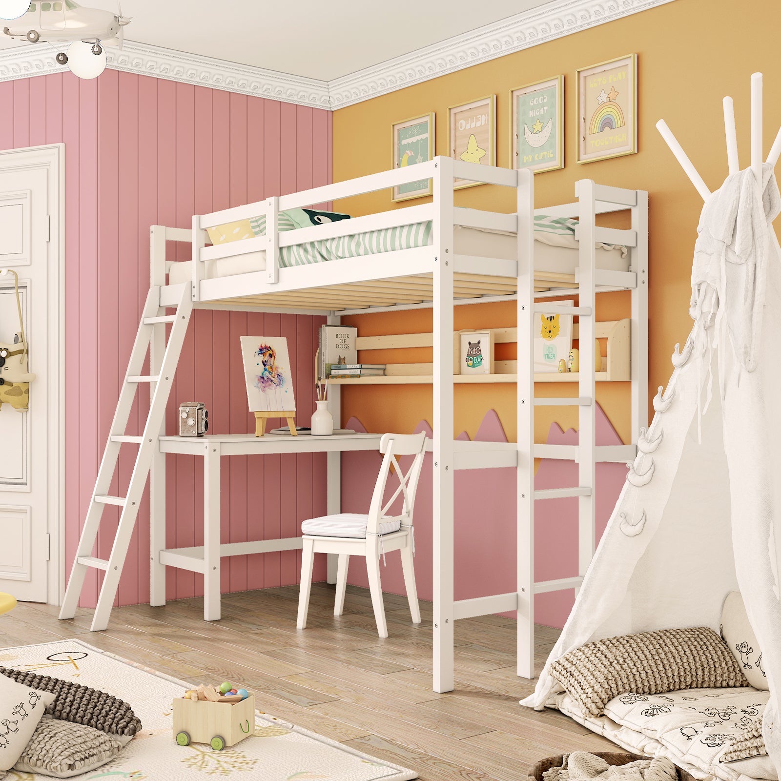 - 2 – in – 1 Space – Saving Design: Combines a loft bed and desk to maximize vertical space and reduce clutter.