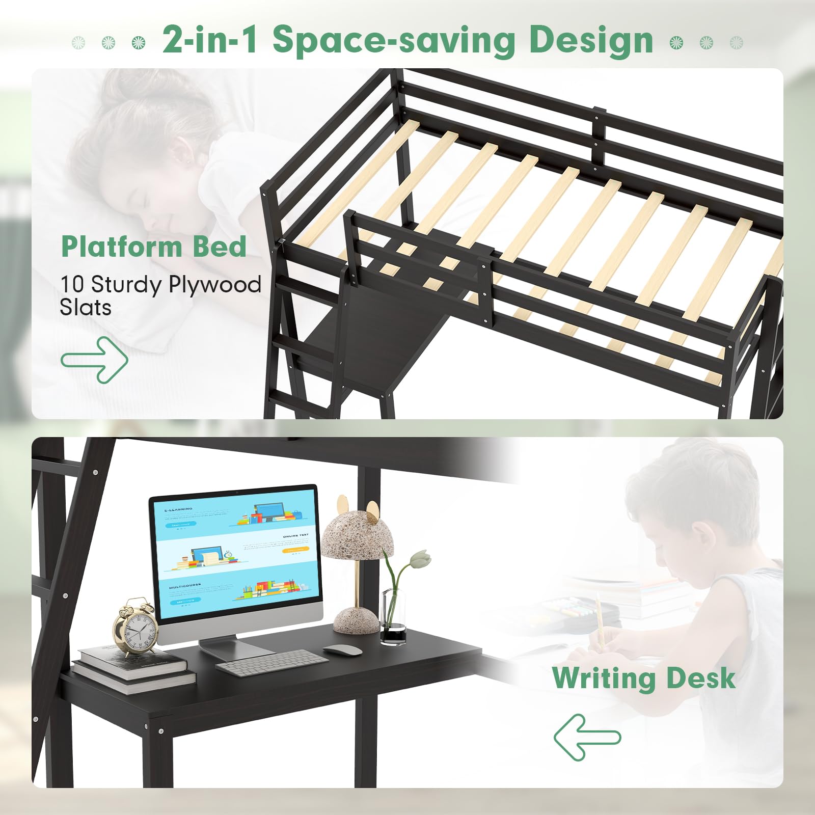 It offers a safe and supportive platform for sleeping and a dedicated workspace for various tasks, all in one unit.