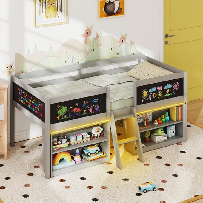 This kids’ loft bed is a versatile piece of furniture that combines sleeping, storage, and play functions. It’s designed for a twin – size mattress and comes with integrated storage shelves and chalkboard panels, perfect for maximizing space in a child’s bedroom.
