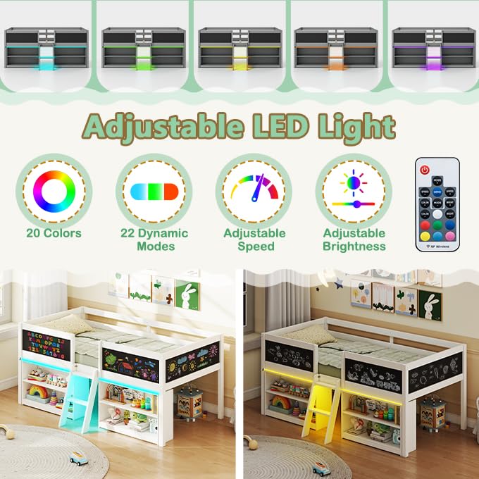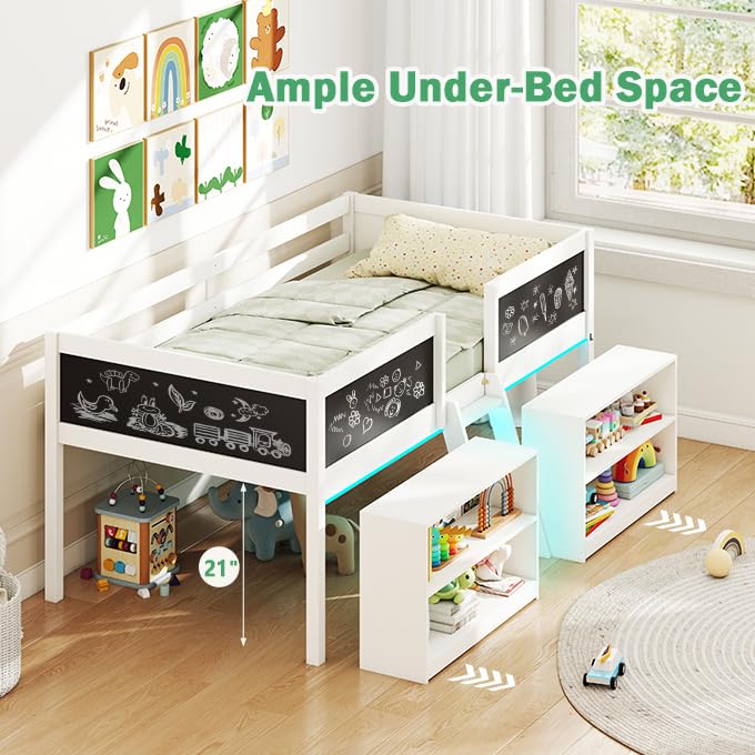 - Two storage shelves below the bed for organizing toys, books, and decorations