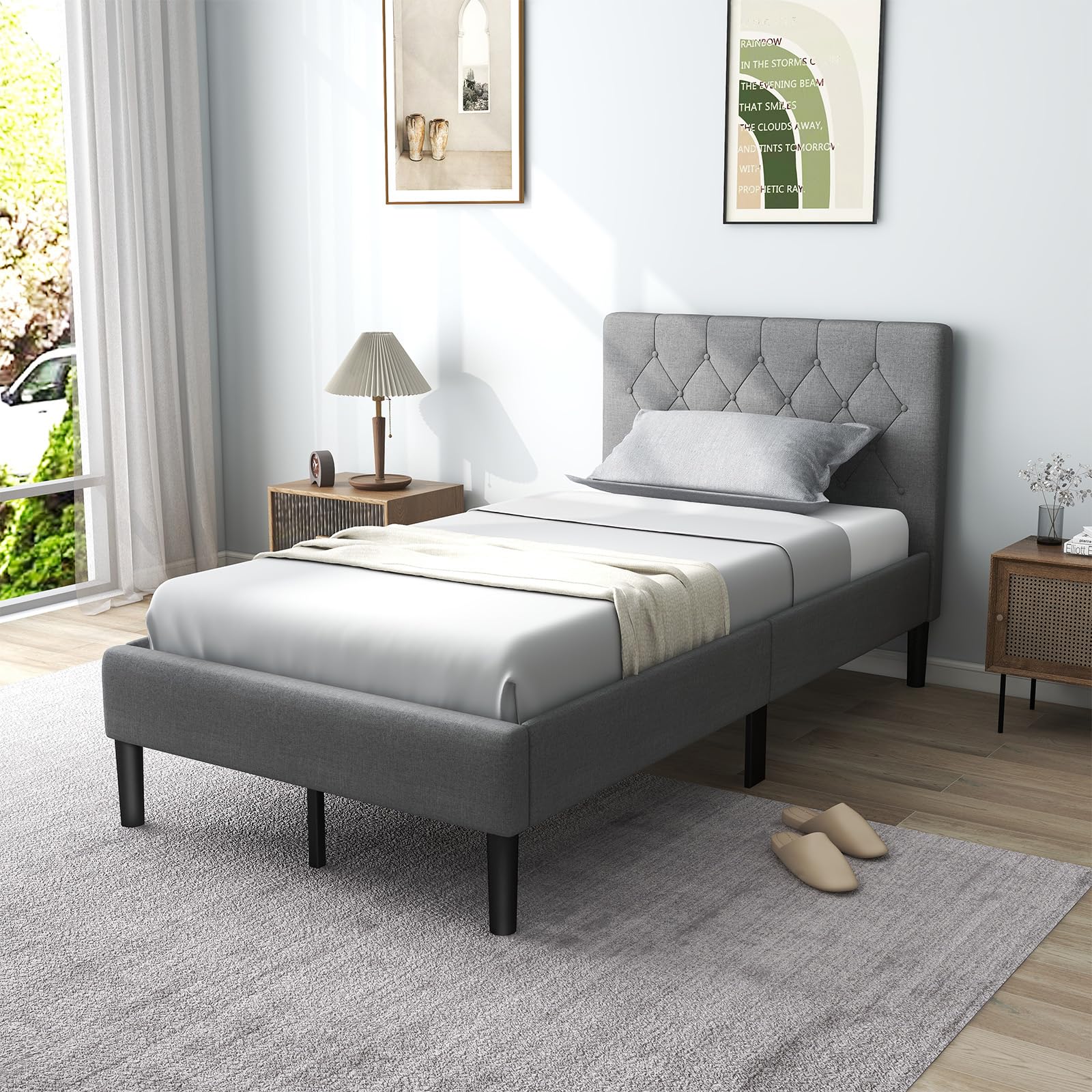 - [Unique & Aesthetic Appearance]: This platform bed with modern headboard is an elegant and practical addition to any bedroom. More, stylish button tufted design and upholstery make up a high – quality and understated appearance.