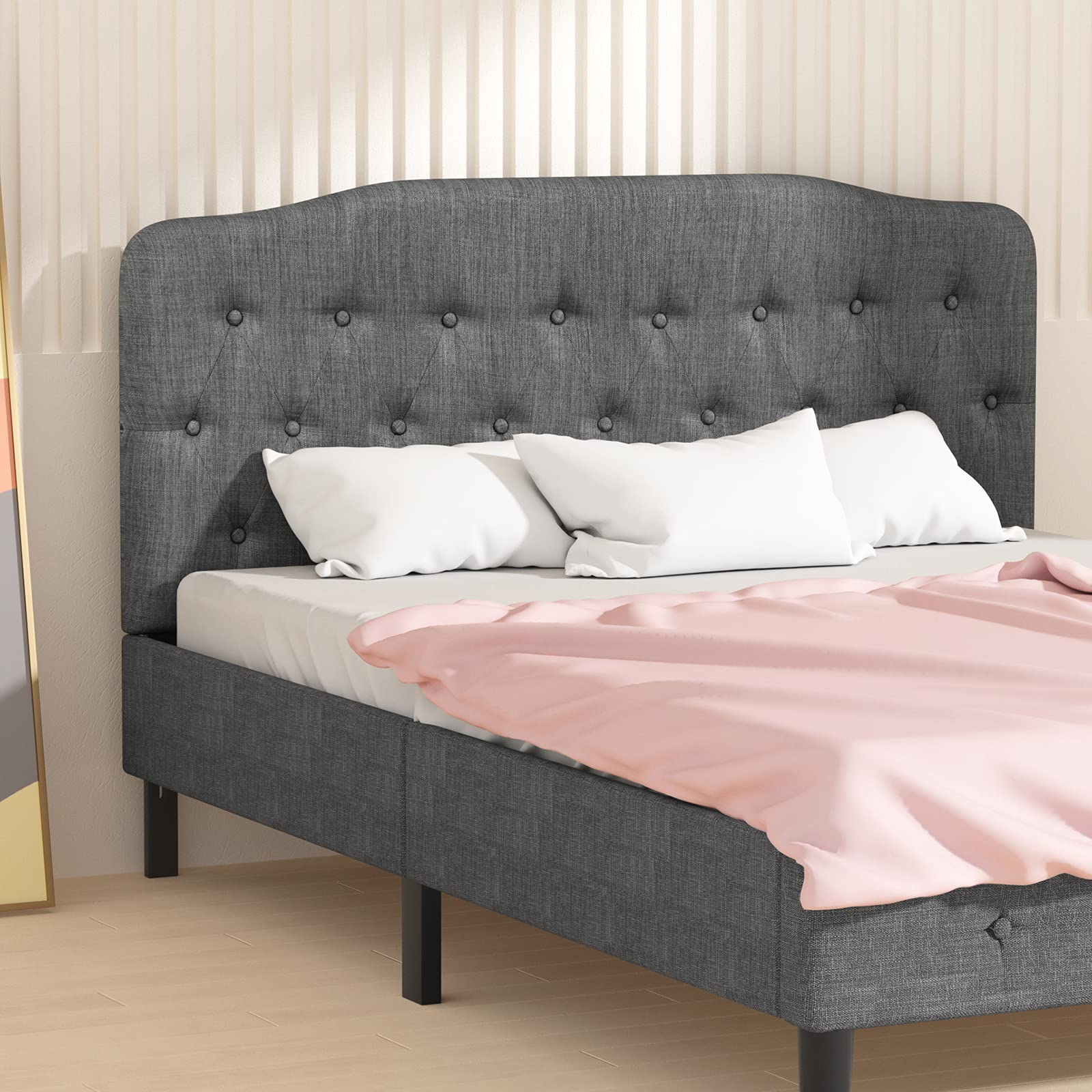 This is a platform-style bed frame with an upholstered headboard. It offers adjustable headboard height and integrated padding for a comfortable sleeping experience. The modern design and quality construction make it a great addition to any bedroom.