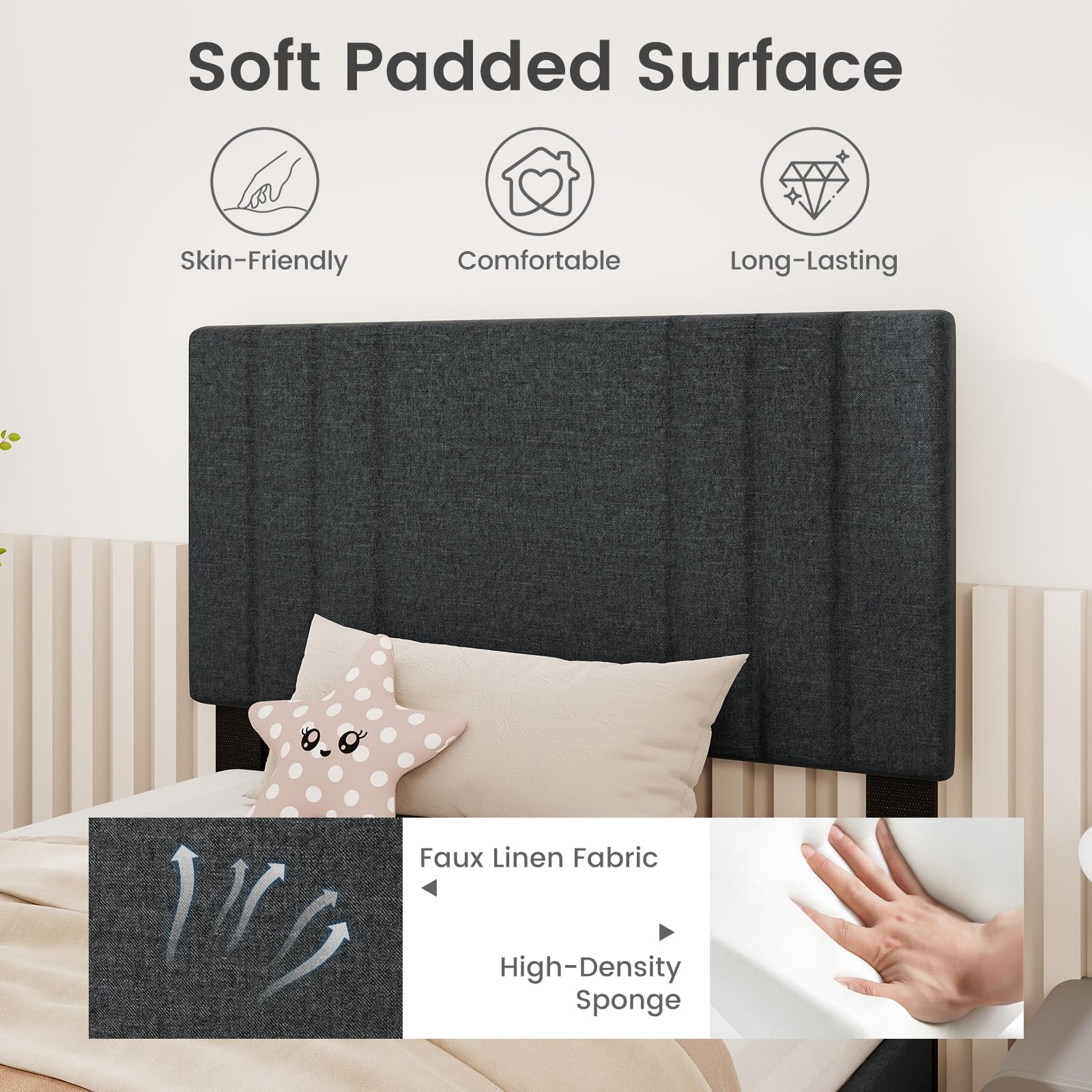 - Upholstered headboard provides comfort for leaning against