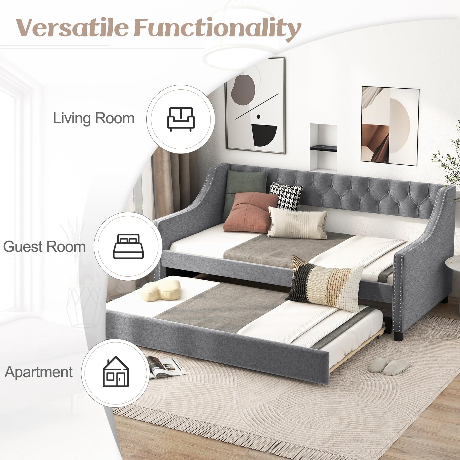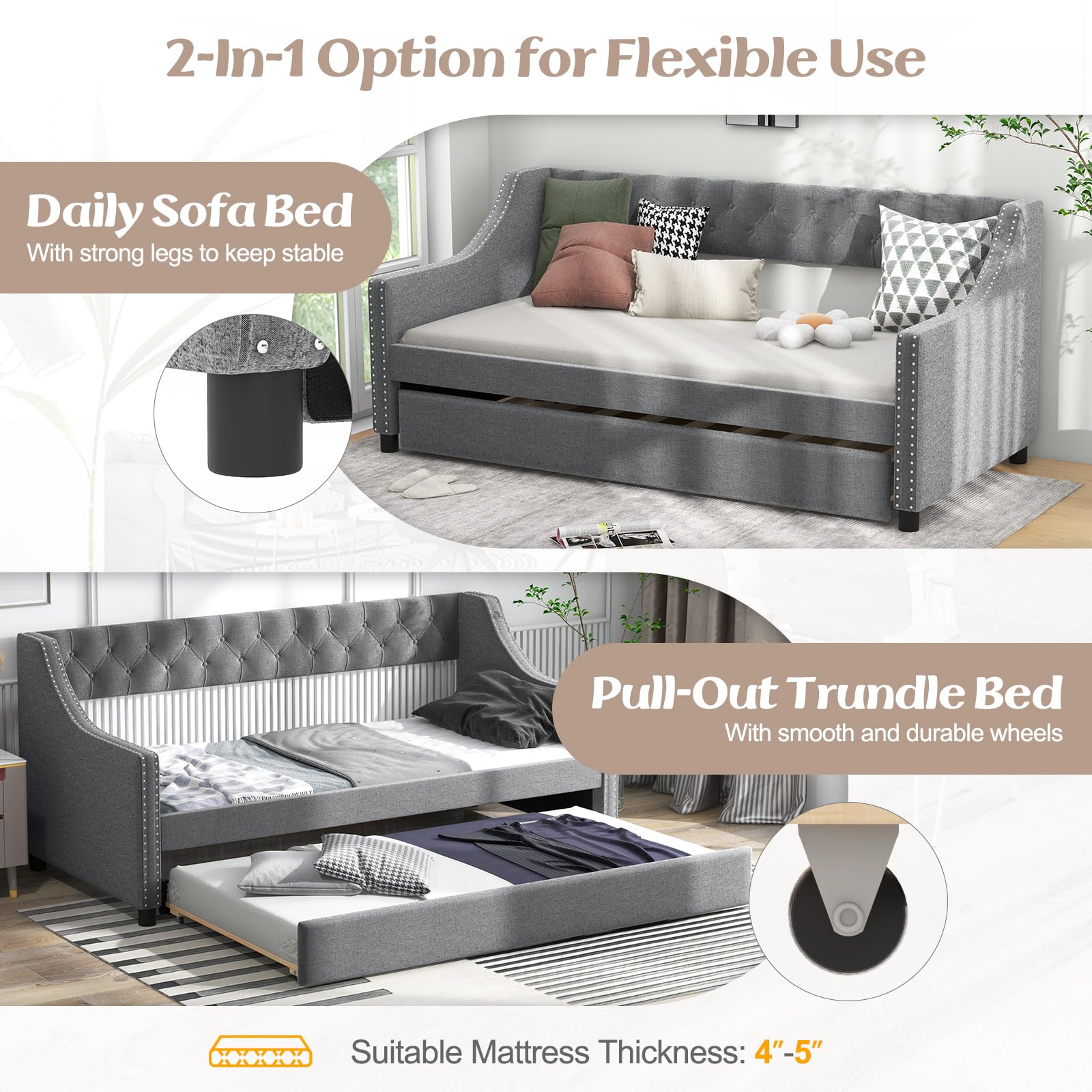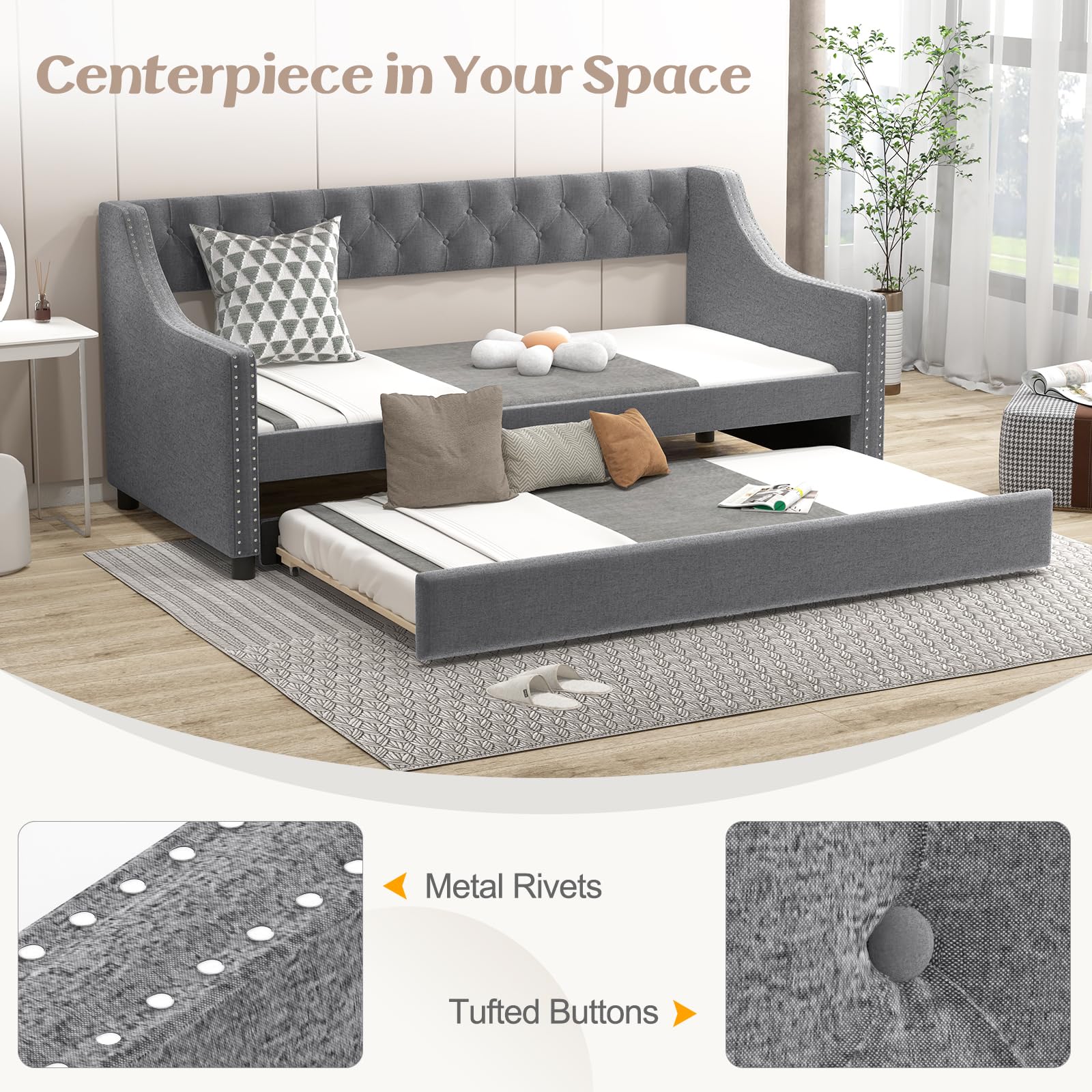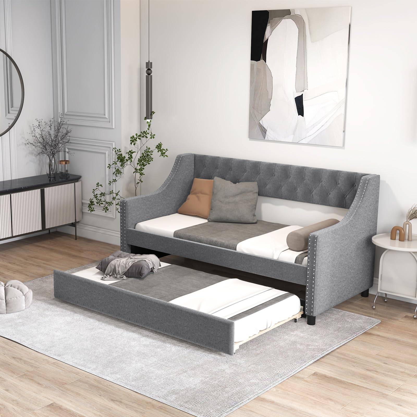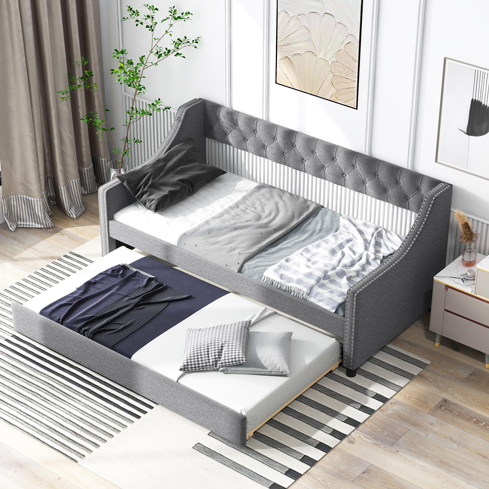 This daybed with a trundle is a versatile piece of furniture. It can serve as a comfortable sofa during the day and transform into a bed at night. The additional pull – out trundle provides extra sleeping space for guests.