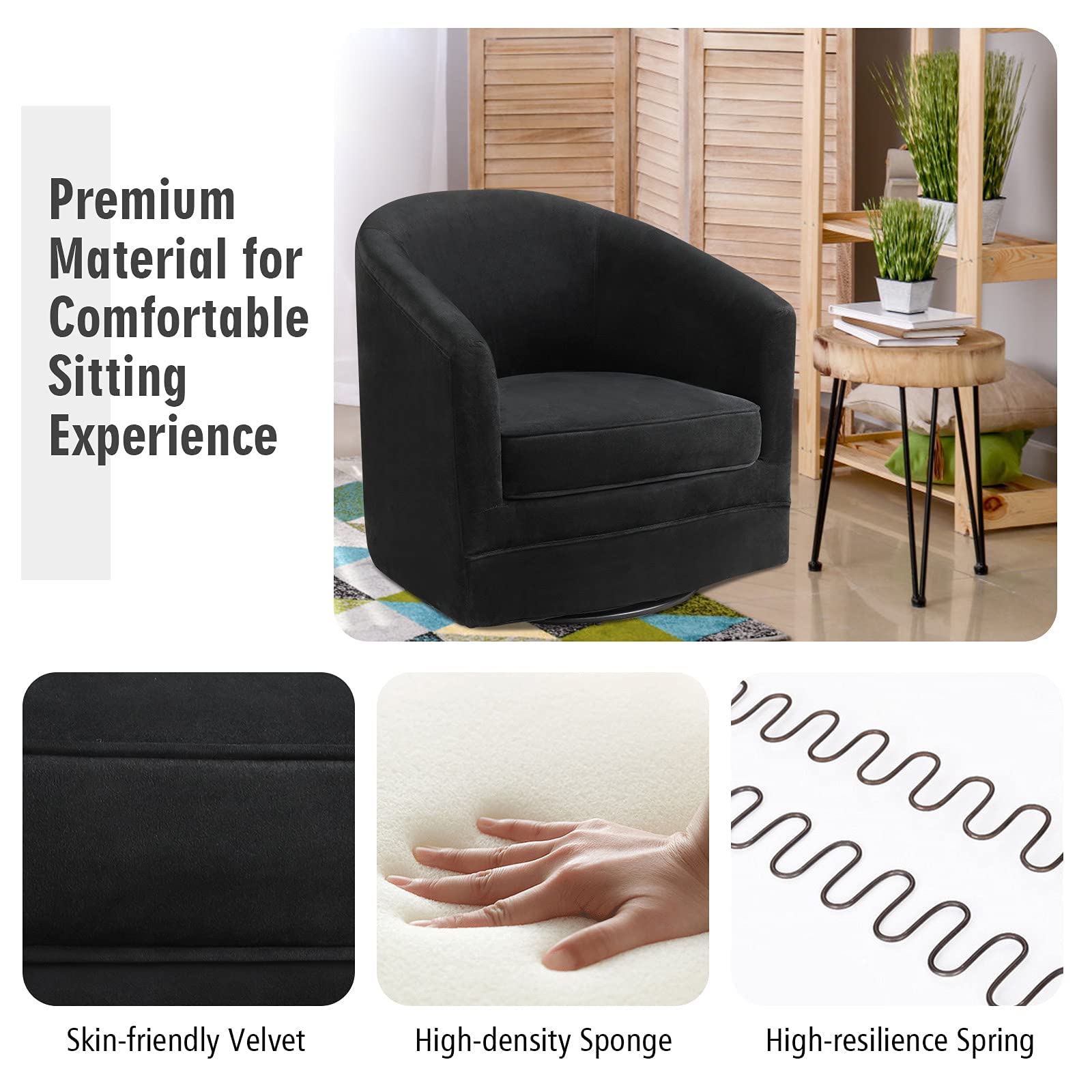 This 360° swivel armchair offers a perfect blend of comfort and functionality. With its classic barrel design and smooth rotation, it provides a cozy seating experience. It’s suitable for various settings like living rooms, bedrooms, and offices.