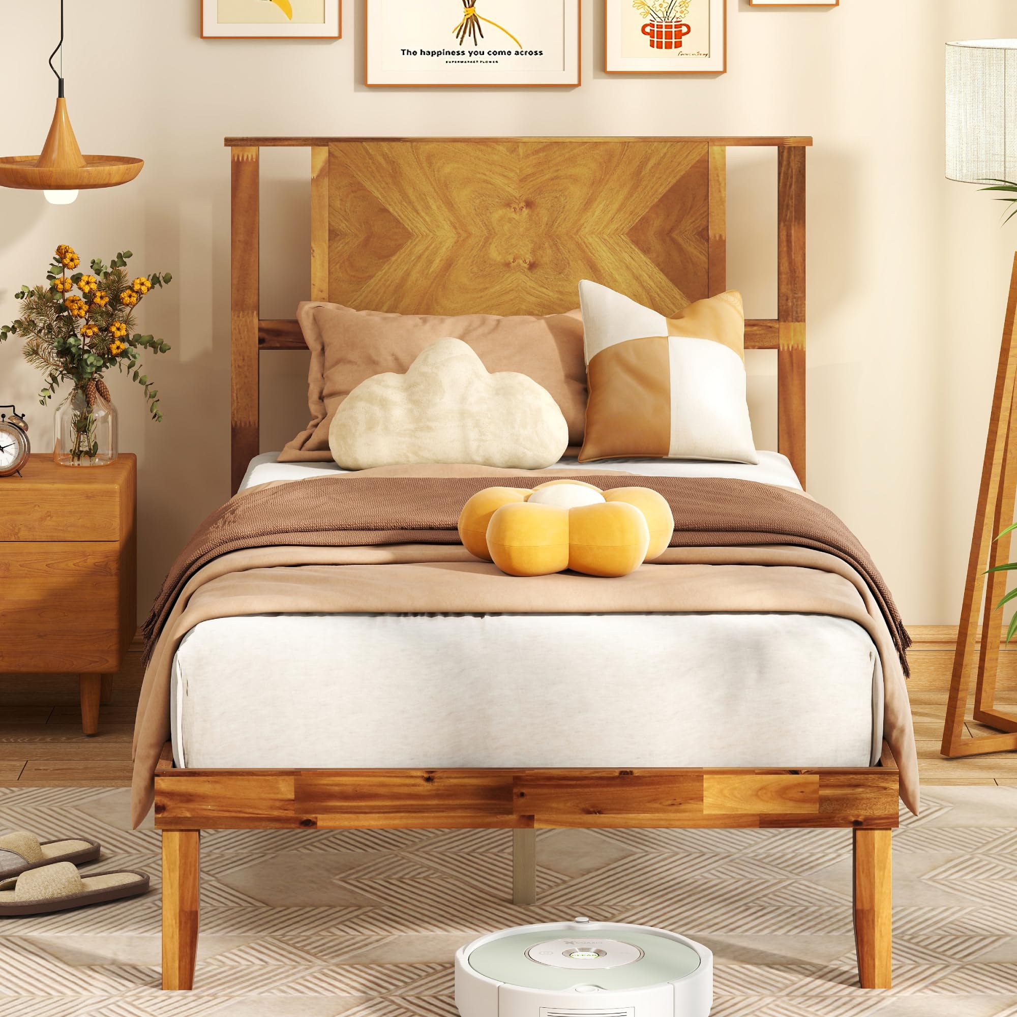 - Decorative headboard panel adds style; smooth finish and natural wood tones suit modern/rustic decor.