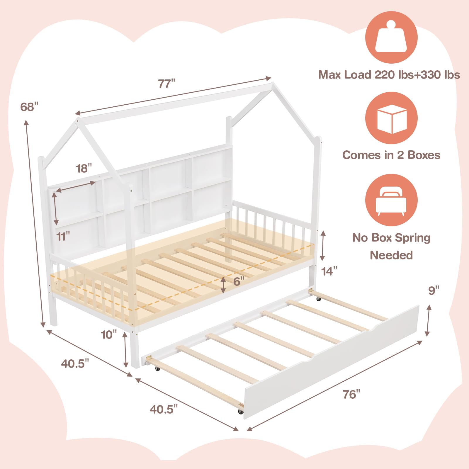 | Trundle Bed Size | 76” (length) × 40.5” (width) × 9” (height, when pulled out) |