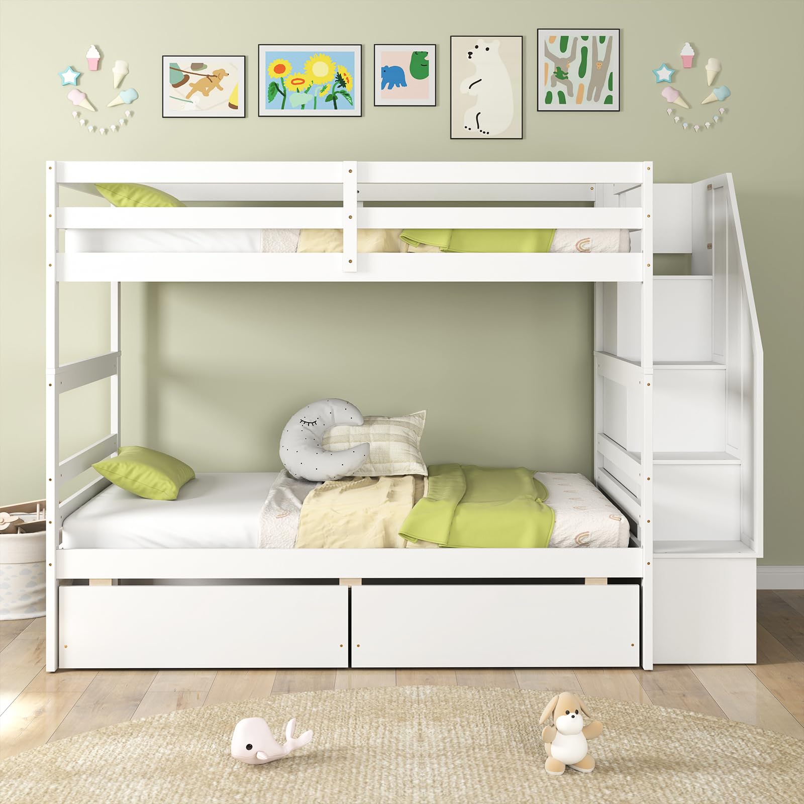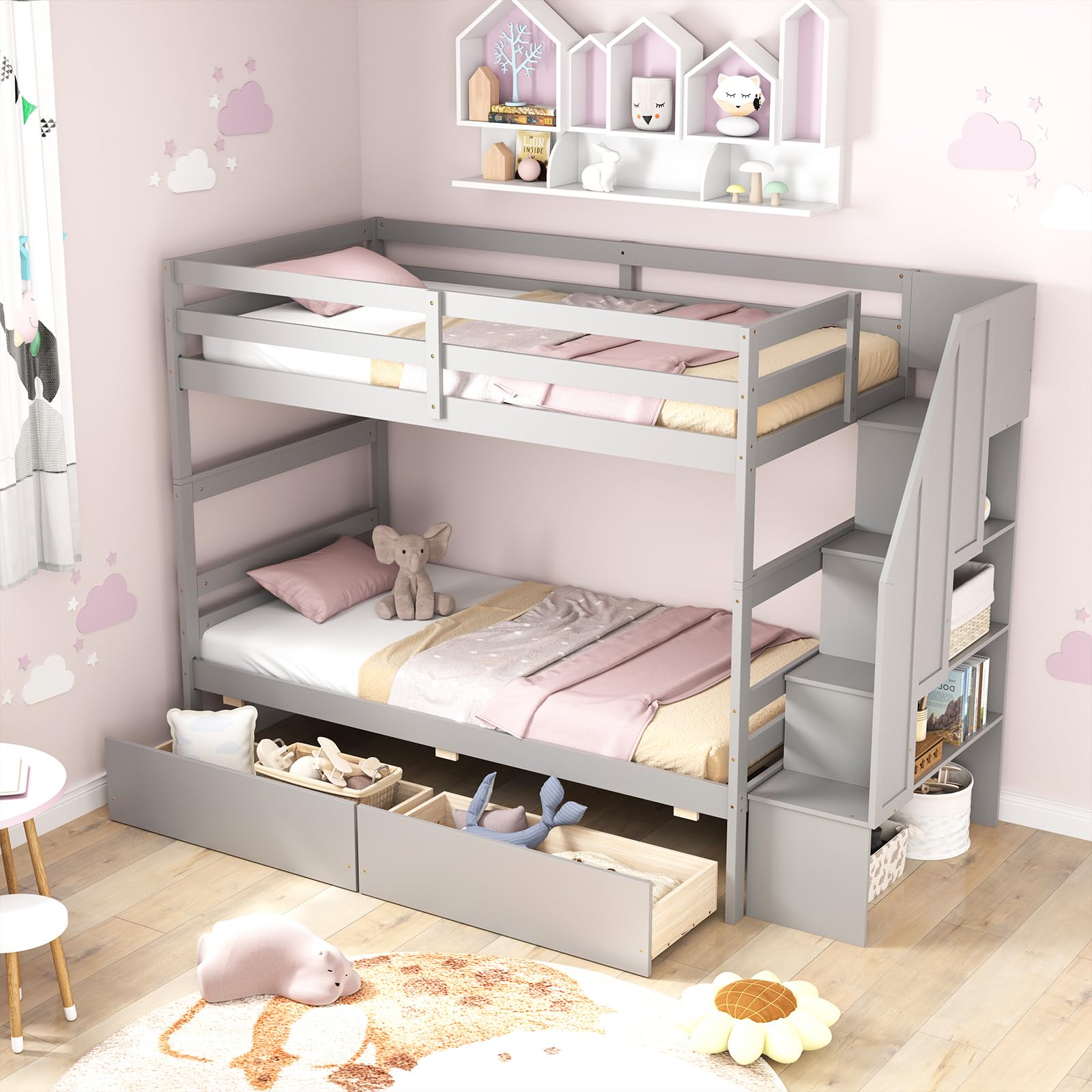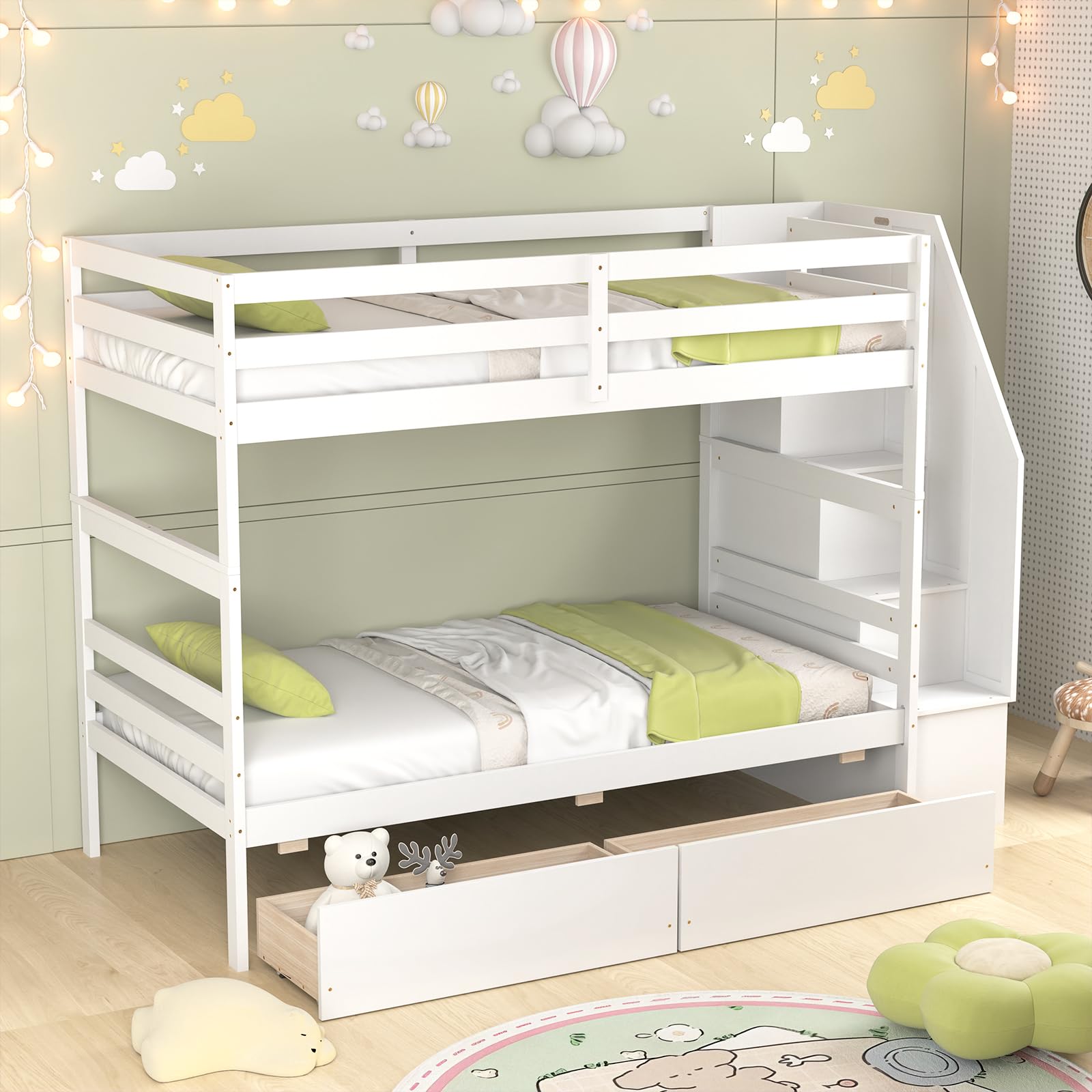 - Stairs for safe climbing and guardrails on the top bunk for safety